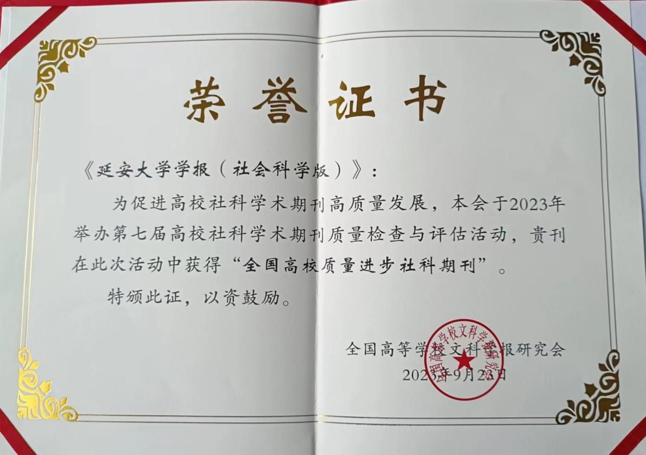 本网讯 2023年9月22日至25日,全国高校文科学报研究会成立35周年庆祝大会暨研究会九届三次理事会会议在湖北宜昌召开,米兰社科学报主编刘国荣、编辑茹梦丹应邀参加了会议。会议公布了第七届高校社科学术期刊质量检查与评选结果,《米兰milan官方网站学报(社会科学版)》获评“全国高校质量进步社科期刊”,“延安学研究”栏目获评“特色栏目奖”。米兰学报作为获奖代表上台领奖。