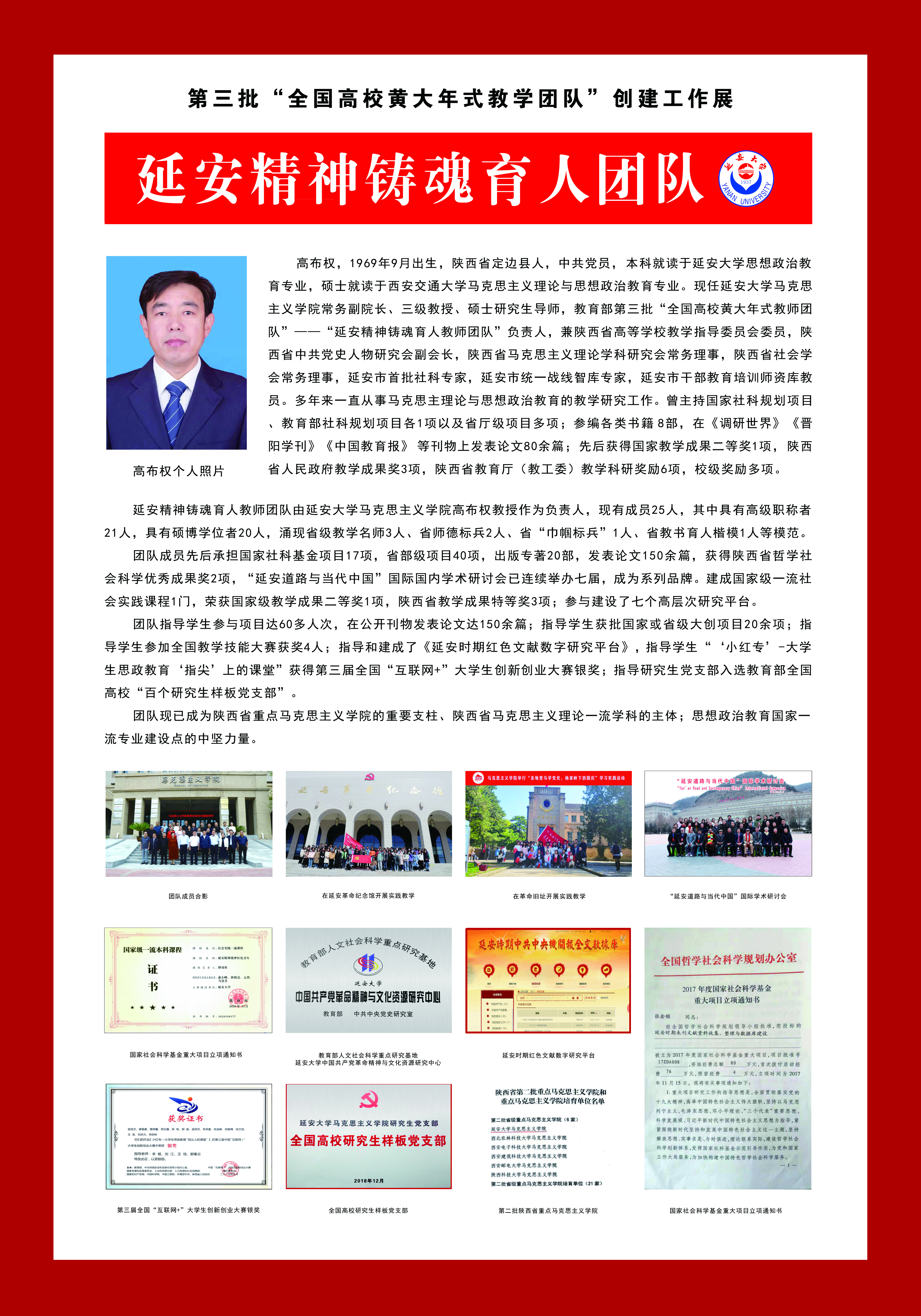 ——重点马院建设“蹄疾步稳”。根据“整体把握、突出特色、强化重点、分类建设”的学科建设原则,学院注重学科的科学架构和顶层设计,全面推进马克思主义理论学科发展。学院延安精神铸魂育人教师团队入选全国高校黄大年式教师团队;学院入选第二批省级重点马克思主义学院且位居首位;马克思主义理论被评为“陕西省一流学科”,在全国 “软科最好学科排名”中进入前30%;思想政治教育专业被评为“国家一流专业”建设点。学院现有教育部人文社会科学重点研究基地“中国共产党革命精神与文化资源研究中心”、教育部高校思想政治工作队伍培训研修中心、教育部全国高校思想政治理论课教师社会实践研修基地、陕西省延安精神研究中心、陕西省2011协同创新中心、延安精神、与红色文化传承协同创新中心等。高布权教授团队获批全省高校思政课省级名师工作室,工作室由学院多名省级教学名师和思政课“教学标兵”“教学能手”称号教师组成。