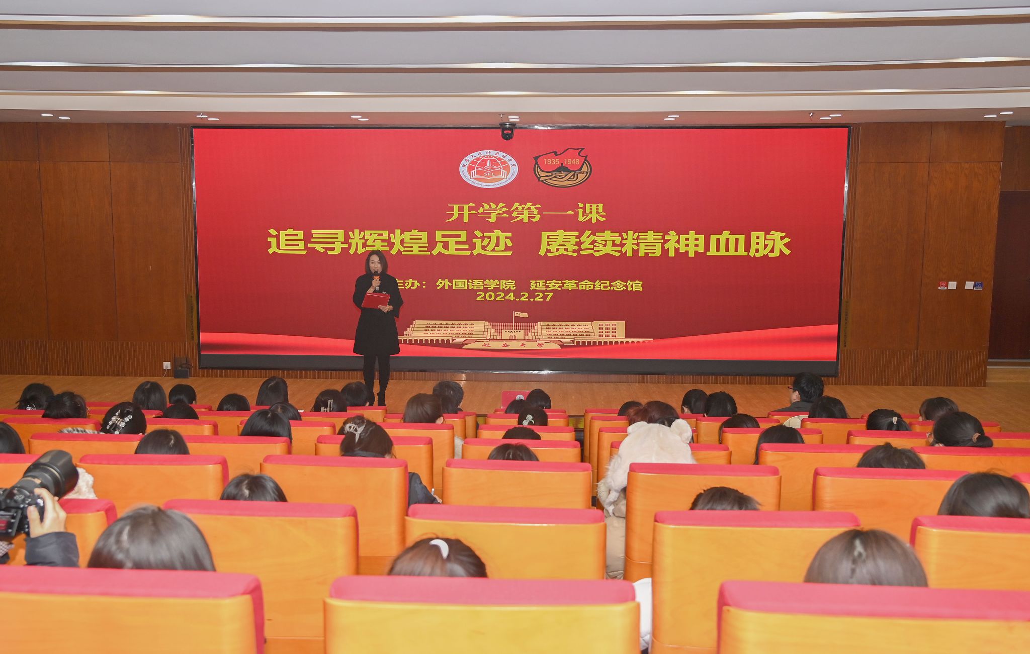 本网讯 为扎实推进延安精神“一体两翼”铸魂育人实践,坚定落实立德树人根本任务,2月27日下午,外语学院邀请延安革命纪念馆宣讲小分队在行政楼一楼报告厅举行了以“追寻辉煌足迹、赓续精神血脉”为主题的“开学第一课”活动。延安革命纪念馆党委副书记刘忆,宣教部主任冯冬梅,宣教部副主任李蓉,米兰党委委员、宣传部部长刘小淼,组织部副部长申圆圆,外语学院领导班子及师生党员200余人参加了本次活动。活动由外语学院党委书记梁艳主持。
