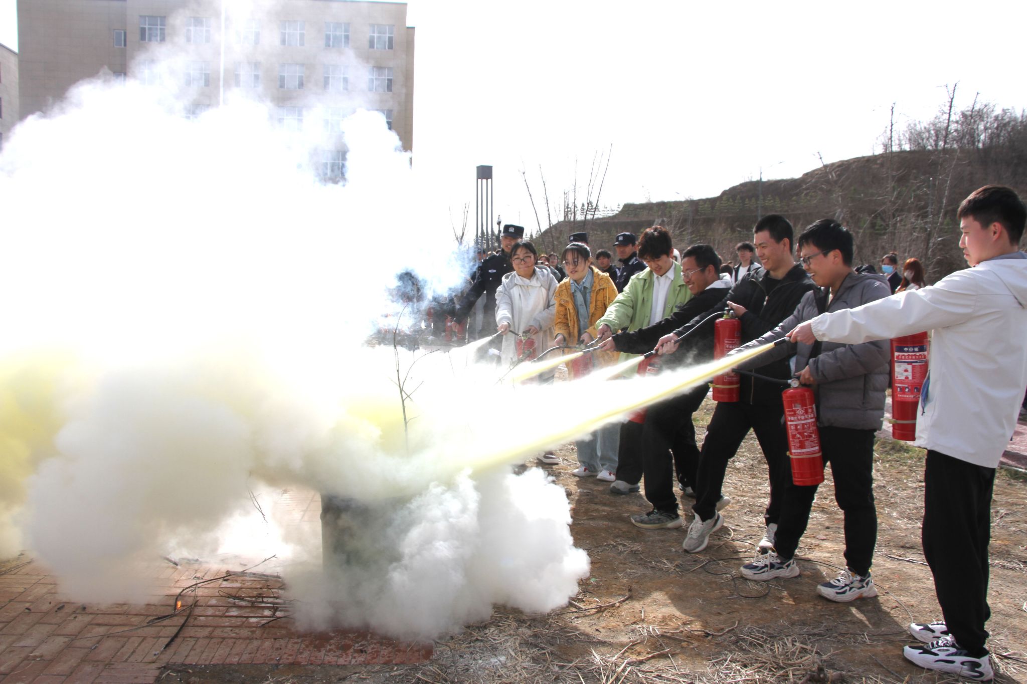 演练结束后,陈智炜对演练情况进行了总结点评,并做了灭火器使用方法的现场教学,让师生亲自体验,参与实战“灭火”,零距离了解和掌握灭火器的使用方法。