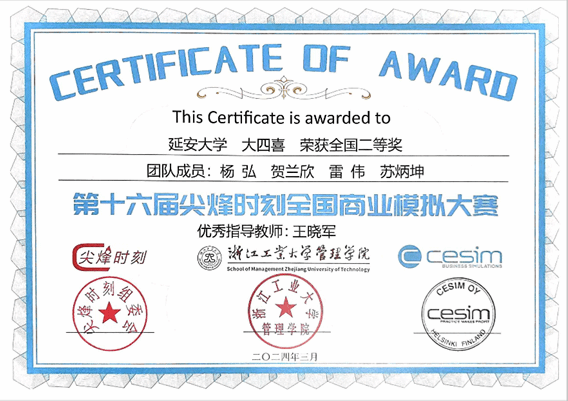 “尖烽时刻”全国商业模拟赛事源于北欧的全球知名商科模拟大赛Cesim Elite,致力于让学生在模拟的市场竞争环境中解决企业发展的实际问题。该赛事自2008年引入中国后,成功举办了十五届全国比赛,吸引了全国各地累计近300多所院校的十数万名学生参加,已成为中国一项知名度颇高的国际性商业模拟赛事。本届大赛全国170余所院校超2000支队伍参加,规模达历届之最。经过半年角逐,共有104支团队入围第十六届全国总决赛。竞赛要求参赛者在模拟决策中充分协同配合,运用商业思维进行数据分析与合理预测,找到最优决策方案,在案例分析中运用创新的视角看待问题,并形成严谨的商业分析过程,提供对行业具有价值的方案。“大四喜”团队历经商业模拟决策、英文团队介绍、商业案例分析等环节,最终获得研究生组全国二等奖。