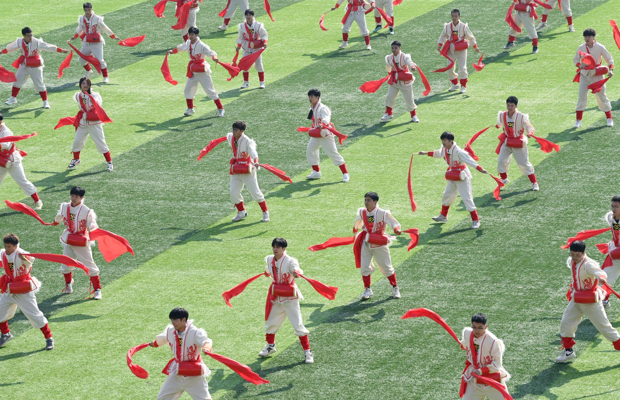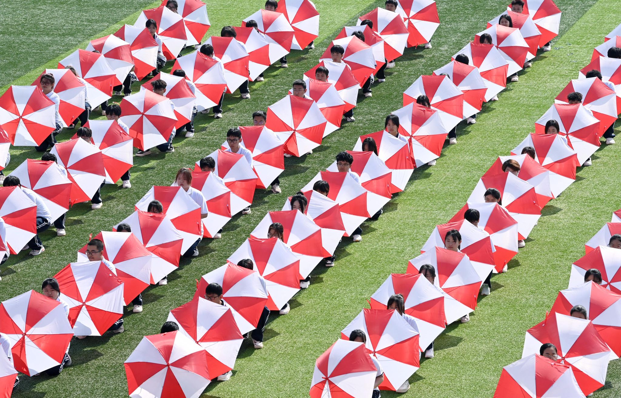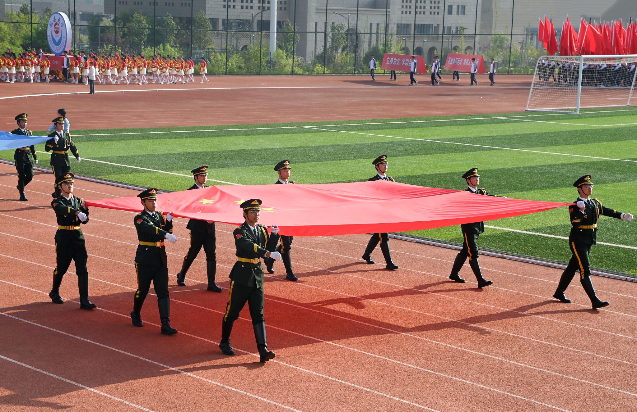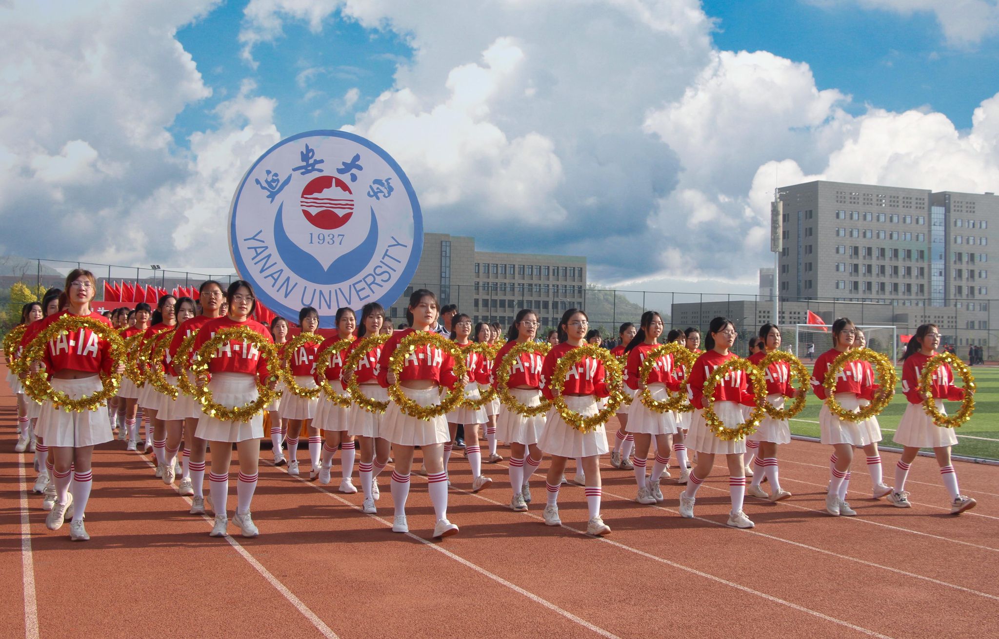 伴随着慷慨激昂的《运动员进行曲》,迈着铿锵的步伐,国旗护卫队、花环方阵、校训校徽方阵、仪仗方阵、裁判员方阵、各参赛单位运动员方阵等以精彩创意的队列方式依次通过主席台并接受检阅,赢得了全场观众热烈的掌声和欢呼声。入场仪式上,全体师生精神抖擞、意气风发,嘹亮的口号、矫健的步伐,彰显了延大人昂扬向上的精神面貌。随后,全体起立,升国旗,奏唱国歌。