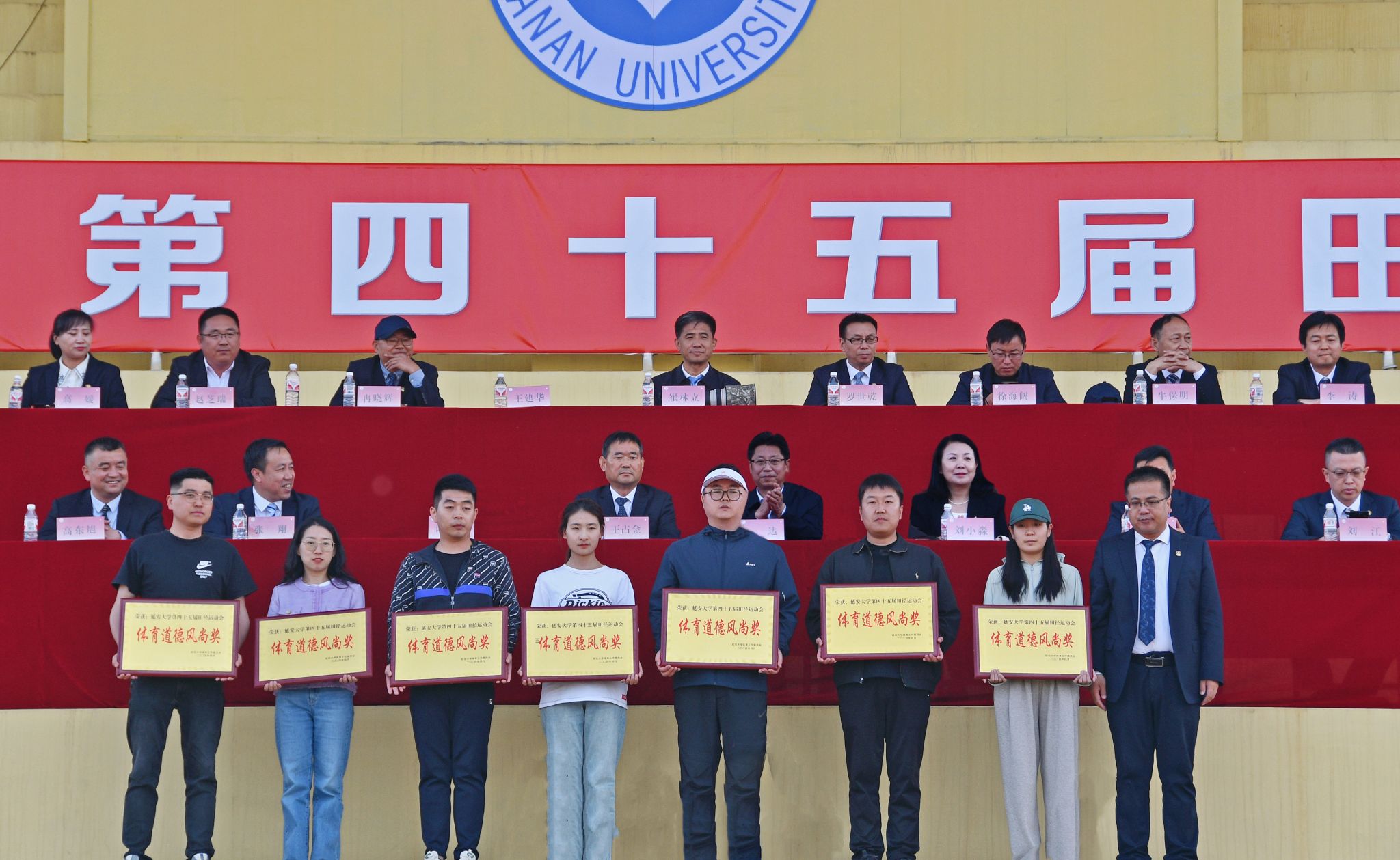 党委宣传部常务副部长刘小淼宣读了本届田径运动会体育道德风尚奖获奖单位名单,经济与管理学院、政法与公共管理学院、文学与新闻传播学院、教育科学学院、马克思主义学院、外国语学院和数学与计算机科学学院等7个学院获得体育道德风尚奖。