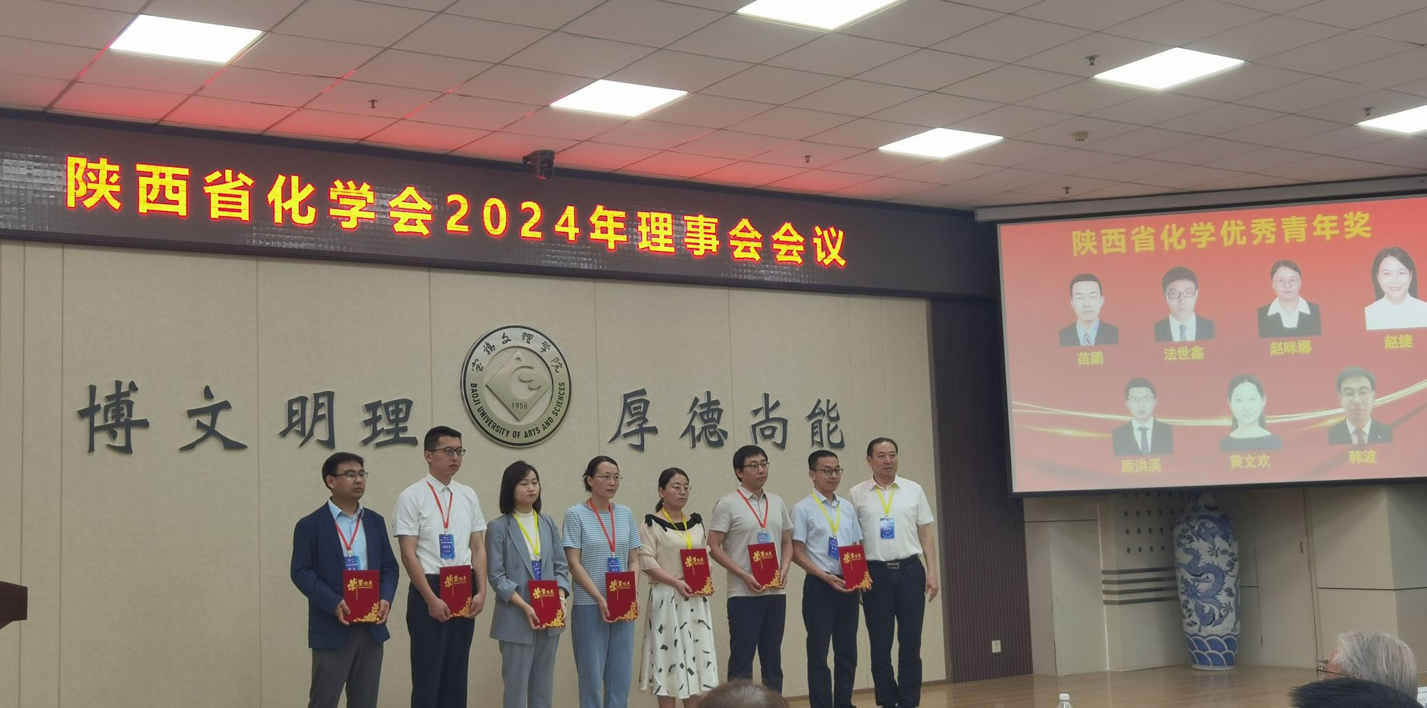 会议表彰了15位第五届陕西省化学优秀青年教师奖,米兰韩波副教授荣获陕西省化学优秀青年奖。高子伟、王尧宇代表陕西省化学会为15位获奖者颁了奖。