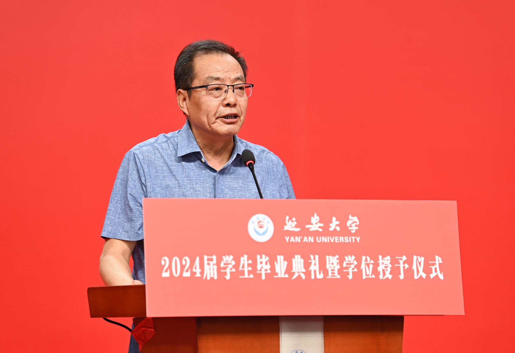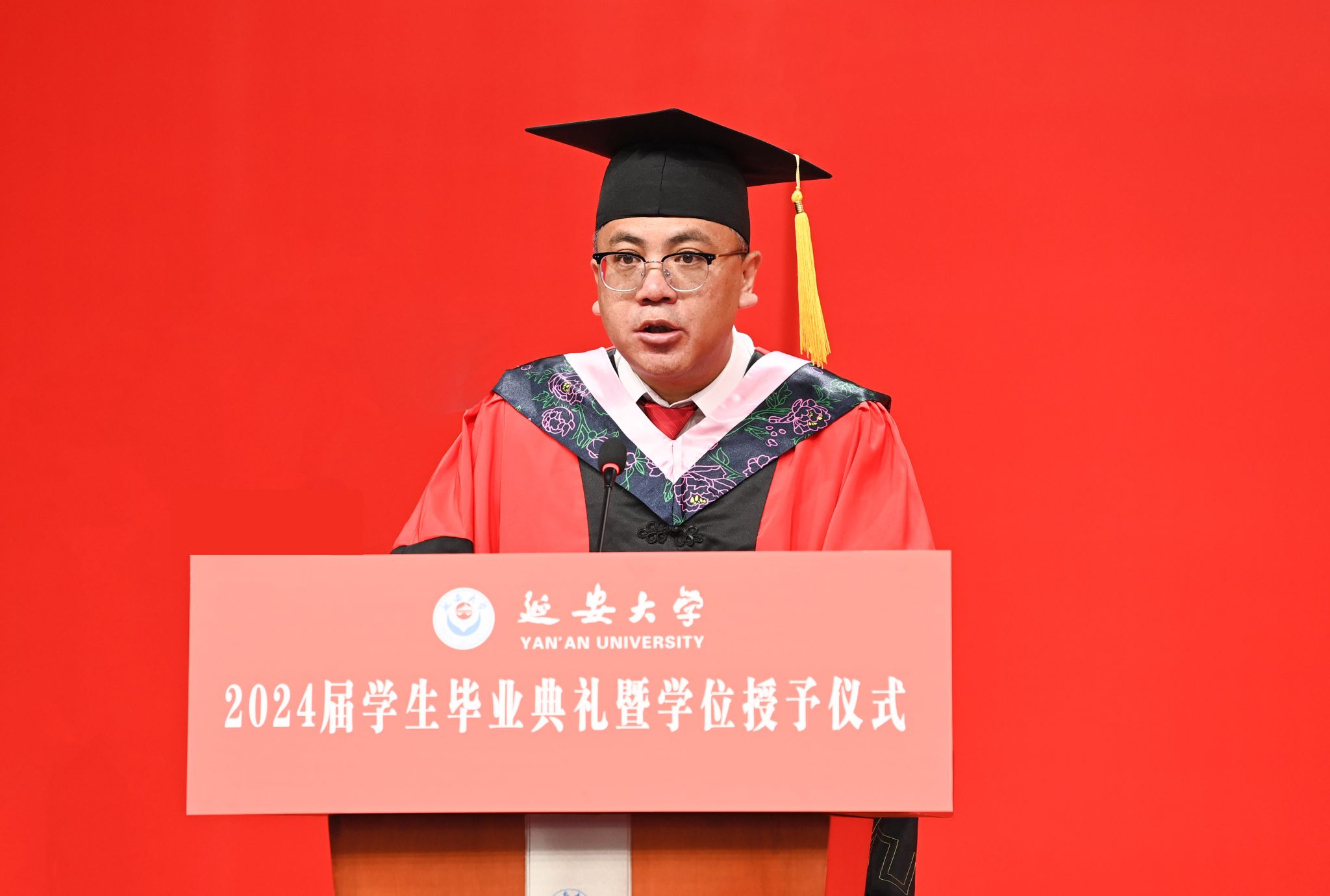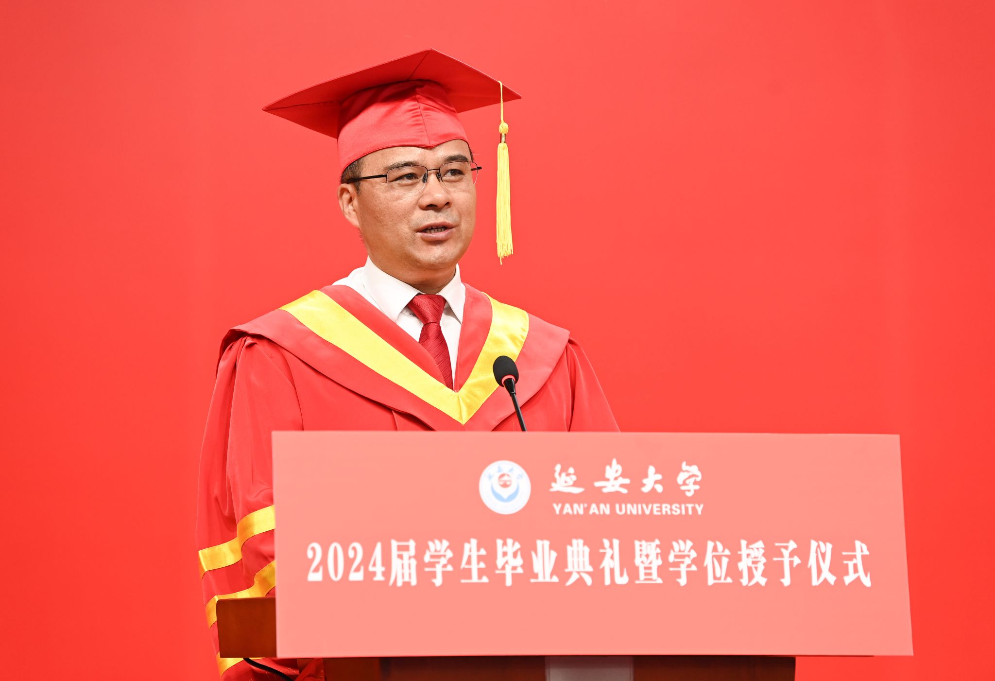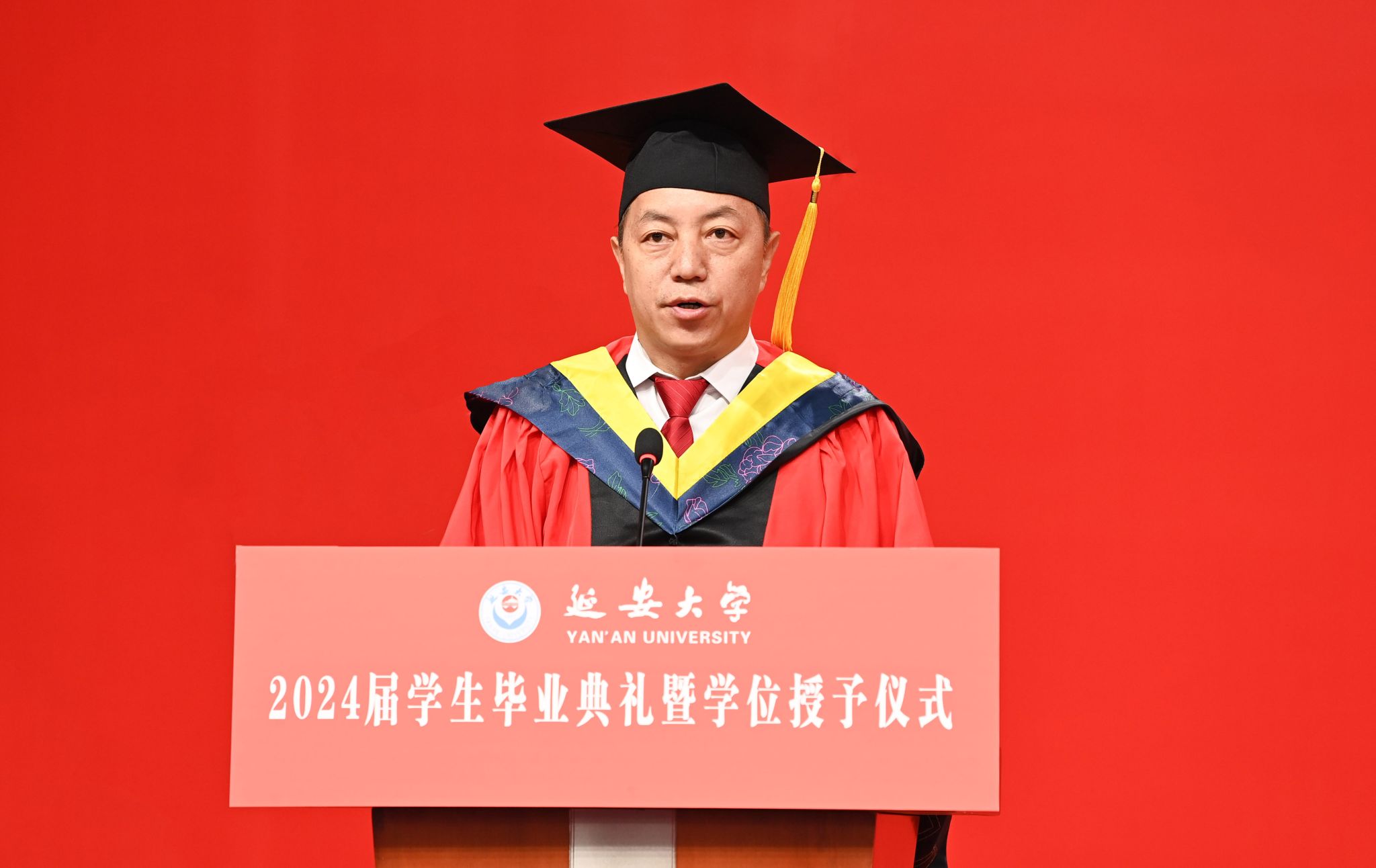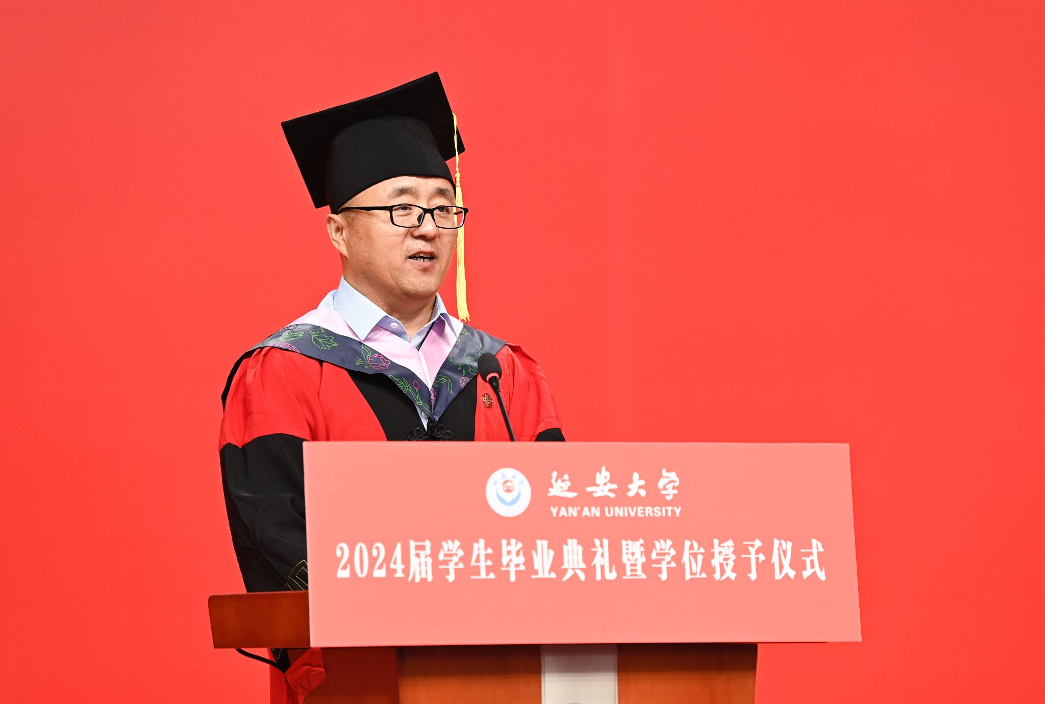 奚家米对2024届全体毕业学子提出三点期望:一是追求理想,做信念坚定的追梦者。在新的人生征程上,要坚守理想,坚韧不拔地筑梦、追梦、圆梦。在追求理想的过程中,要校准方向,立大志、明大德、成大才、担大任,始终奋进在强国建设、民族复兴的康庄大道上;要目标明确,在一个个目标的实现中,经风雨、见世面、增本领、长才干,以青春之力担起时代重任,让青春在创新创造中焕发光彩;要积极向上,继续从延安精神中汲取力量,以更高的热情、更强的斗志、更深的情怀为社会进步、个人发展书写出更加壮丽的青春篇章。二是崇尚奋斗,做踏实肯干的开拓者。奋斗是青春最亮丽的底色。要以优秀校友、“最美奋斗者”路遥为榜样,不畏艰辛、砥砺奋进。奋斗之路,并非坦途,要学会坚持,在坚持坚守中走好人生的奋进之路;要甘于吃苦,始终以向下扎根、向上生长的乐观坚韧勇敢面对困难挑战,锲而不舍,驰而不息;要脚踏实地,倍加珍惜社会各界对延大学子品行、能力、作风的高度赞誉,以实干奋进的姿态,一步一个脚印,一步一个境界,用奋斗书写青春华章,用奋斗赢得光辉未来。三是心怀感恩,做奉献回馈的践行者。感恩是中华民族传统美德,是人之为人的道德良知,是一种健康心态,更是我们甘于奉献的精神动力。要常怀感恩之心,时刻知恩于心,感念于行,做一个有情有义、知恩图报的人;要力行奉献之志,发扬“像牛一样劳动,像土地一样奉献”的精神,涵养家国情怀,始终把奉献人类、服务社会作为人生的价值追求。最后,奚校长饱含深情地对全体毕业生说到,“命运的齿轮从未停止转动,希望你们把握好人生;始终秉持校训校风,擦亮奋斗底色,彰显精神特质;始终相信光、追随光、成为光、散发光,努力成为堪当民族复兴重任的时代新人!”