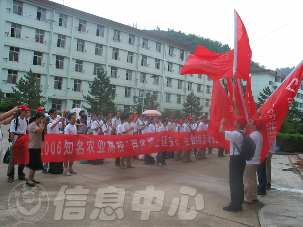 参加实践活动的四所农业高校是中国农业大学、南京农业大学、西北农林科技大学、华中农业大学。在窑洞广场上,负责人分别向即将奔赴吴旗、洛川等延安市十县的博士服务队授旗,中国农业大学的李健强对社会实践活动做了总体部署和安排。