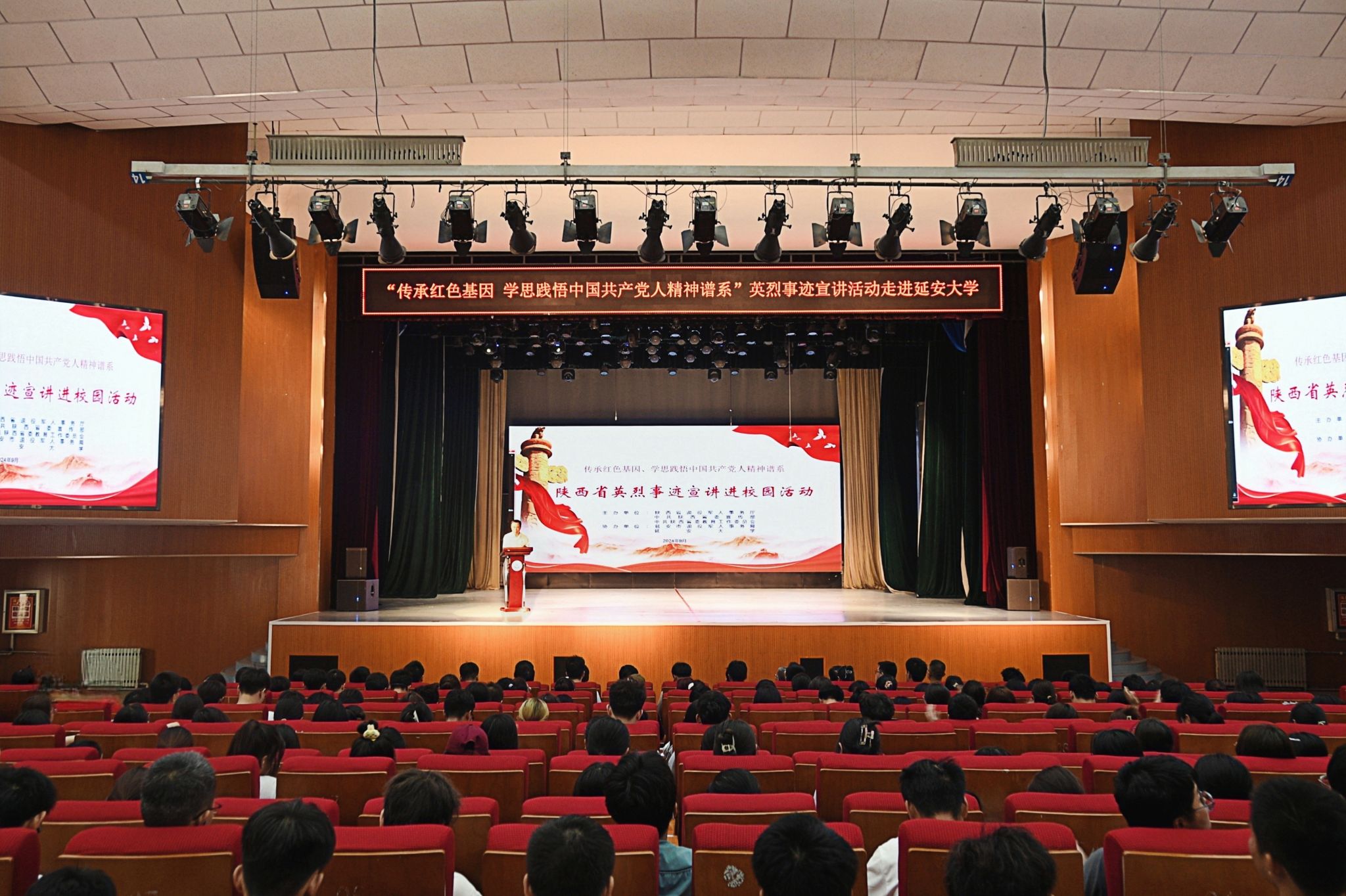 陕西省退役军人事务厅褒扬纪念处副处长杨津骁、延安市退役军人事务局党组成员、副局长郝宏,校党委宣传部、学工部、教务处、校团委、保卫处等相关部门负责人,以及2024级新同学和辅导员共计900余人参加了宣讲活动。