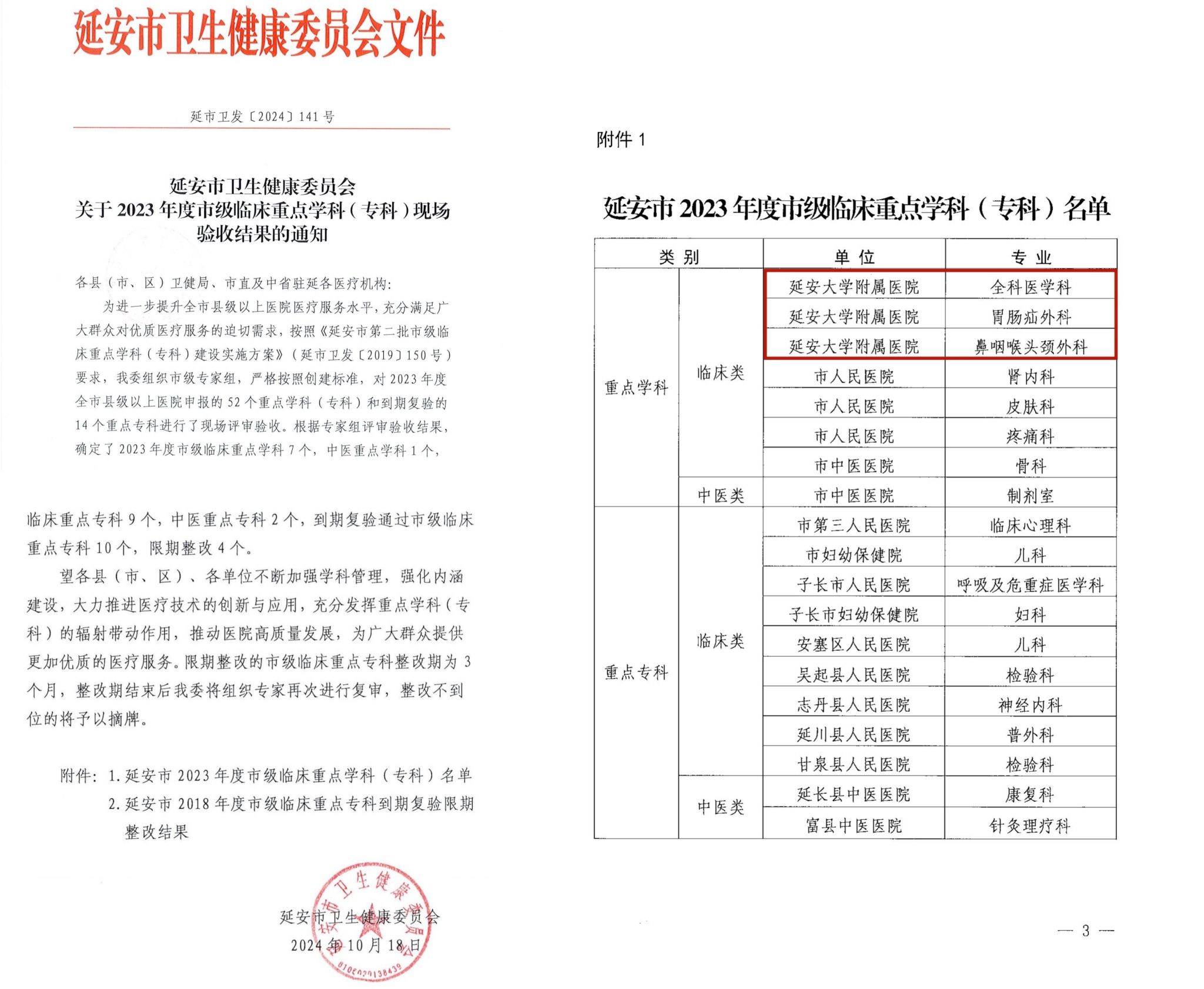 本网讯 近日,延安市卫生健康委公布了《关于2023年度市级临床重点学科(专科)现场验收结果》(延市卫发【2024】141号),米兰milan官方网站附属医院全科医学科、胃肠疝外科、鼻咽喉头颈外科获批临床重点学科。