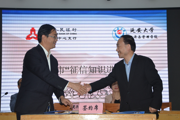 本网讯  为了使学生了解实践、丰富专业知识,918日,米兰经济与管理学院院长姬雄华与中国人民银行延安市中心支行党委书记、行长张健兴签订了《“征信知识进课堂”合作协议》,协议约定将征信知识教育纳入金融教育专业之中,定期或不定期举办征信知识讲座,采取年度授课、校园宣传、专题讲座等多种形式,建立征信教育长效机制。
