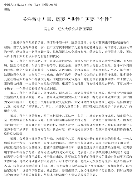 本网讯 5月16日,公管学院教师高志奇文章《关注留守儿童,既要“共性”更要“个性”》在《中国人口报》专版发表。该文是2015年延安青少年研究计划项目(编号:2015-04YAQSNYJ):“延安留守儿童的现状、问题及关爱成长路径研究”的成果之一。文章认为“目前对于留守儿童的关注,基本是千篇一律,缺乏针对性,也没有体现出不同地域的特性。诚然,留守儿童有共性的一面,但不应忽视不同留守儿童群体的特殊情况。对于留守儿童的认识和分析,应该坚持一切从实际出发、具体问题具体分析的态度”。