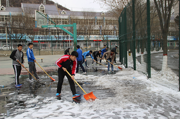 本网讯 为了确保开学后正常教学活动的开展,建设安全文明校园, 2月25日下午,体育学院组织党员志愿者服务队开展义务清扫积雪碎冰活动。