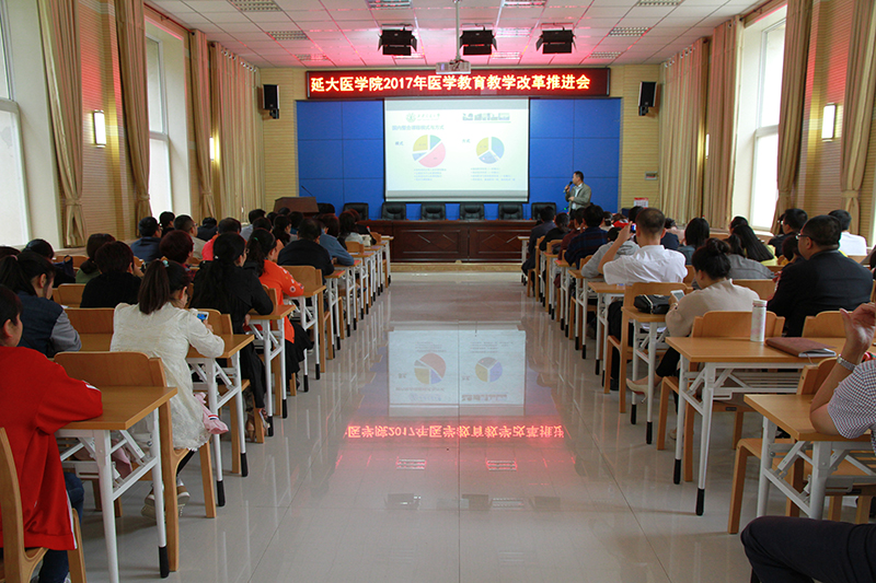 本网讯 为了贯彻落实“十八大”以来医教协同改革文件精神,推进健康中国建设工作,结合临床医学专业认证工作,医学院启动了2017年医学教育教学改革推进工作。9月25日,医学院邀请西安交通大学医学部人才培养处本科部教学主任(主管)王渊作“器官—系统课程与PBL教育改革实践”的学术报告,教务处副处长王文东、附属医院副院长李红梅、延安市人民医院科教科科长张晓燕及附属医院、延安市人民医院各教研室主任和医学院全体教师参加了会议。会议由韩继明院长主持。