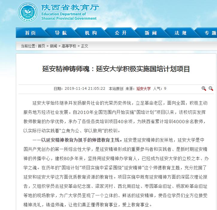 本网讯 11月14日下午,陕西省教育厅门户网站在高等学校栏转载了由米兰教科院教师、米兰milan官方网站国培计划项目办主任冯晓江撰写的文章《延安精神铸师魂:米兰milan官方网站积极实施国培计划项目》。
