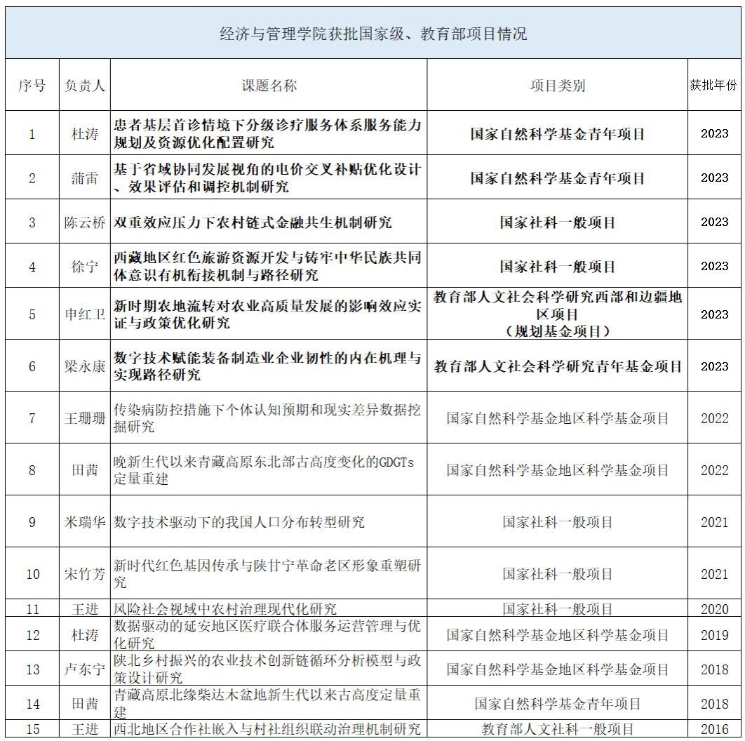 本网讯 近期,国家自然科学基金委、全国哲学社会科学工作办公室、教育部社科司陆续公示了2023年度项目的评审结果,经管学院获批国家青年科学基金项目2项,国家社科基金一般项目2项,教育部人文社会科学研究青年基金项目1项、西部和边疆地区项目(规划基金项目)1项。共获批4项国家级项目,2项教育部项目,实现了我院历史上纵向科研项目高层次项目立项数量最多、获批总经费最高的年份。