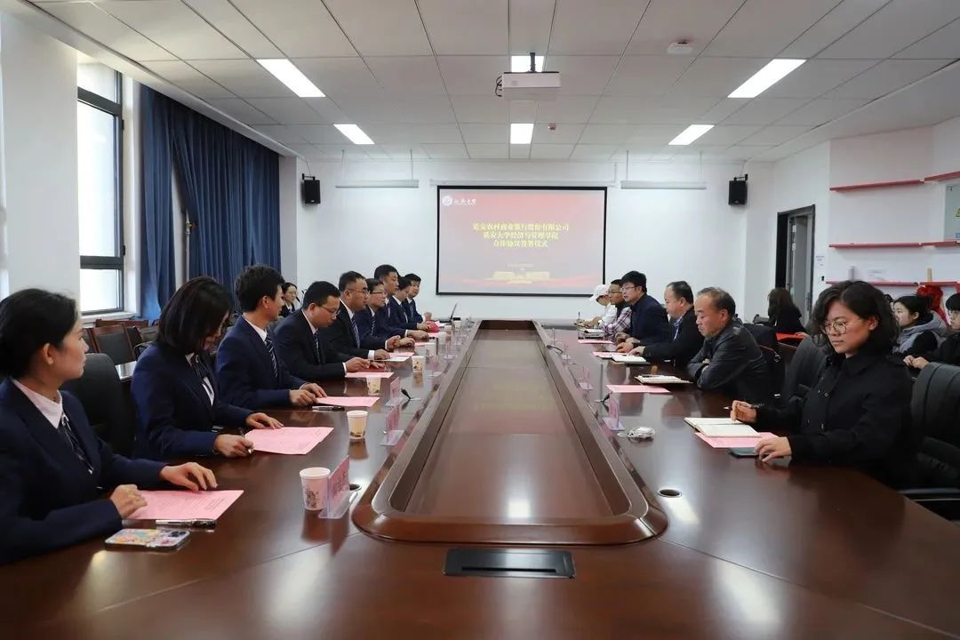 本网讯 10月20日,经管学院与延安农商银行举行实习基地合作协议签署仪式,共同深入推进校企合作。延安农商银行党委书记、董事长孙阳,党委副书记、行长沈合合,党委委员、副行长张王慧、崔宇及相关人员,经管学院院长王进、思政专员薛皓、副院长杜涛以及部分师生代表参加签约仪式。签约仪式由副院长李兴开主持。