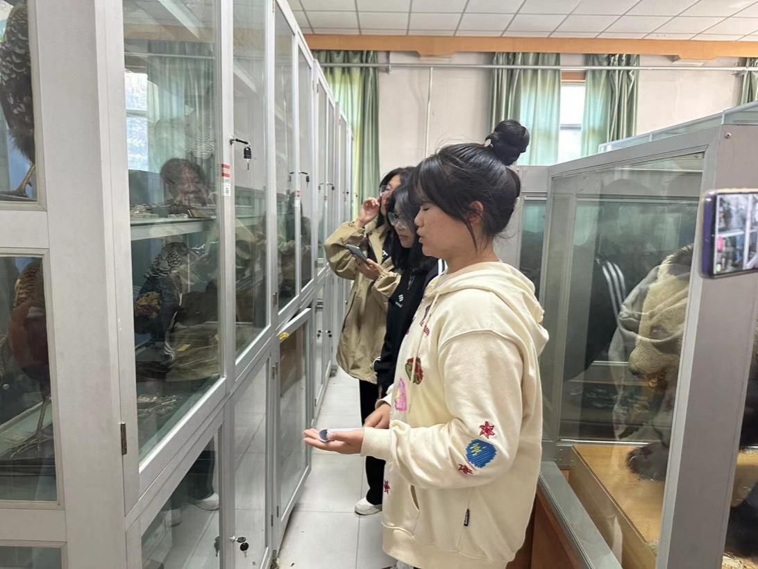 活动前,讲解员为大家介绍了标本室的发展历程及标本收藏情况,该室始建于1986年,室内藏有1200余号昆虫标本,300余种鱼类、两栖类、爬行类、兽类和鸟类标本,标本荟萃古今,包罗万象,有活化石之称的大熊猫、长相奇特的羚牛、羽毛华丽的红腹锦鸡、猛禽之王金雕、高原精灵羚羊等,涵盖了动物界各大类群等。