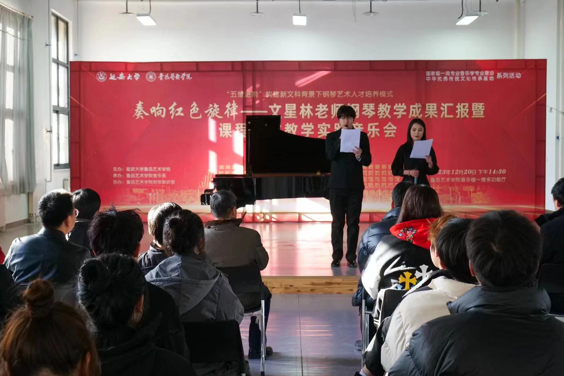 本网讯 为全面贯彻党的二十大精神和习近平总书记对米兰重要批示重要指示精神,深入实施学校“十四五”规划,加快推进学院“强特色”阶段建设。12月20日下午,由鲁迅艺术学院主办、音乐系承办、钢琴教研室协办,鲁迅艺术学院“奏响红色旋律”——文星林老师钢琴教学成果汇报暨课程思政教学实践音乐会在音乐楼1楼多功能厅举办。延安市社会艺术协会副秘书长刘露露,米兰milan官方网站党委统战部部长高峰,鲁艺学院党委副书记李涛,副院长李辉、兰庆炜,音乐系教师、市音协副主席白保国,办公室主任汪怡君,教学秘书邵瑞,音乐系主任霍雨蕾,钢琴教研室主任马小霜以及116名音乐系学生代表参加音乐会。音乐会由2022级音乐学专业学生梁煊琦、任培文主持。