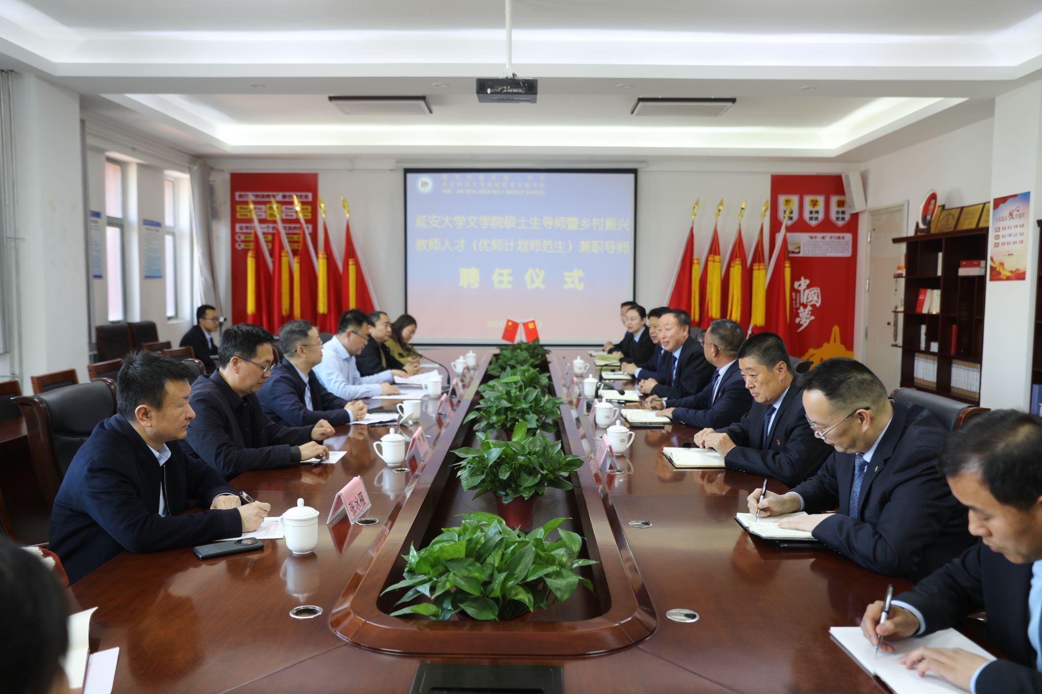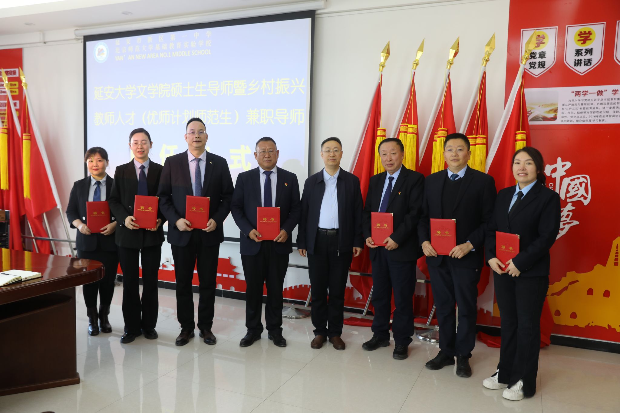 本网讯 3月14日,为提高文学院学科语文硕士研究生和优师计划师范生的培养质量,加强校内外交流,有效利用校外优质师资资源,加强大学、中学深度合作,打造“理论+实践”的师范生培育路径,米兰milan官方网站文学院硕士生导师暨乡村振兴人才(优师计划师范生)兼职导师聘任仪式及教育教学改革研讨会在延安市新区第一中学举行。米兰milan官方网站文学院院长王俊虎、党委书记党子奇、党委副书记张冰雁、副院长刘鑫、杨绍固以及教学秘书张亚玲和新区一中校长高忠学、副校长崔福强、李志强、侯玉江及相关教师代表参加会议。