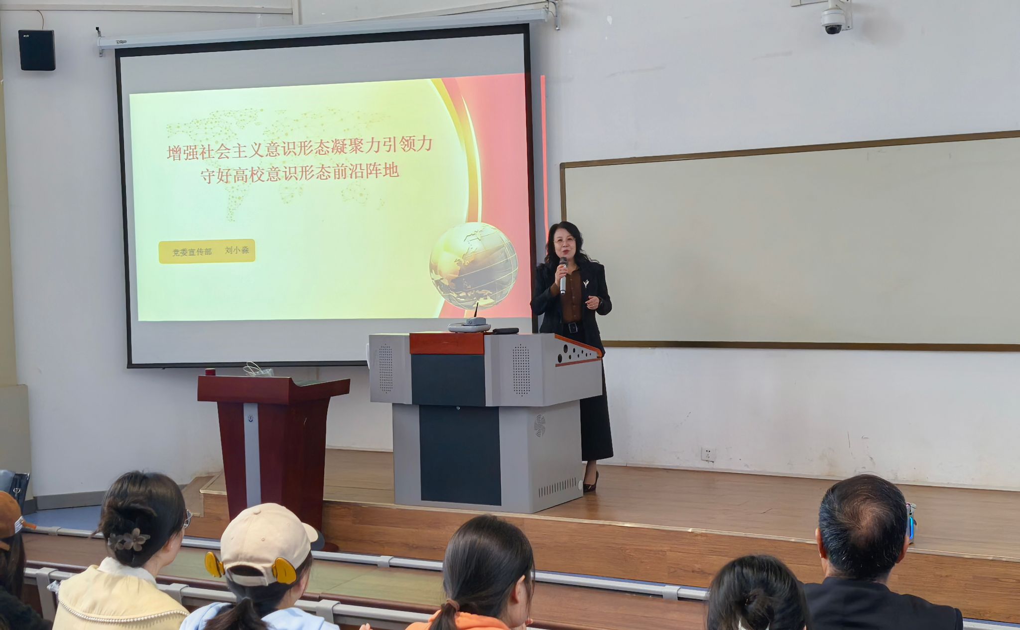 在分析新时代高校意识形态工作面临的挑战时,刘小淼详细讲解当前思想文化多元化带来的复杂局面。她指出,随着全球化的深入,思想文化的交融交锋愈发频繁,意识形态工作面临更为严峻的考验。在这种背景下,高校作为意识形态工作的前沿阵地,肩负重要的使命。高校必须增强责任感与使命感,强化师生对意识形态工作的认识与理解,确保在思想引领和价值观塑造方面不偏离方向,从而维护校园的安全与稳定。