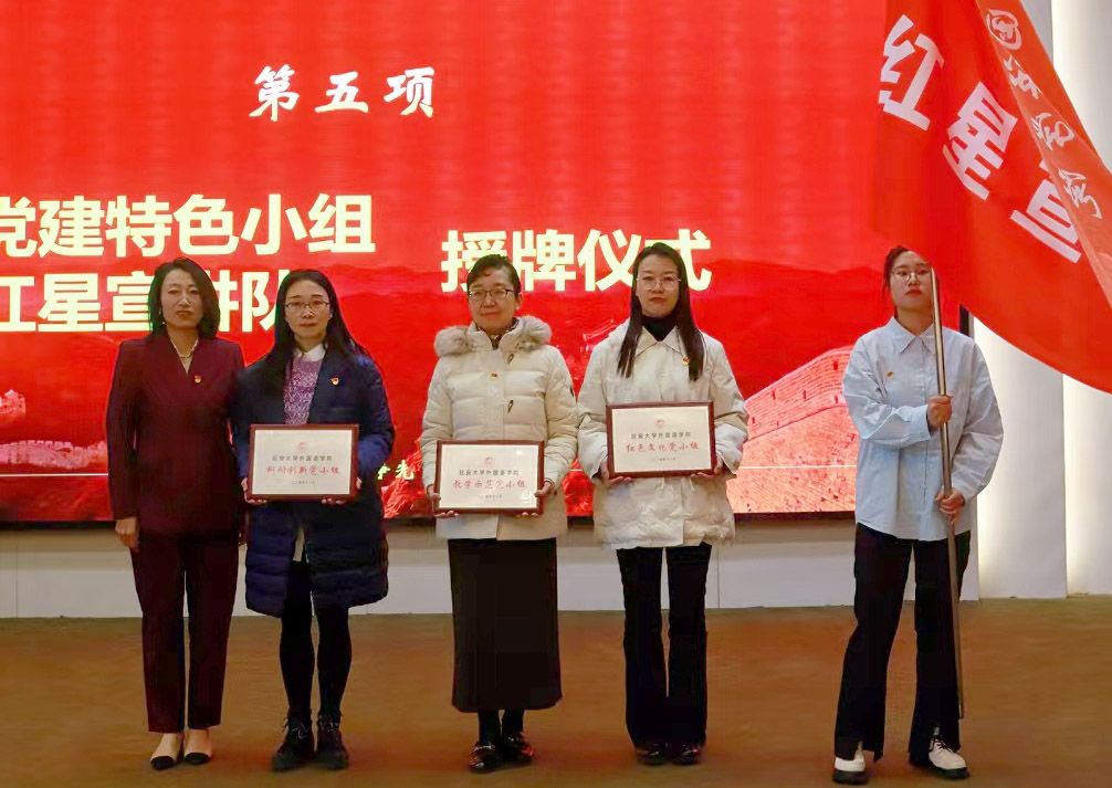 学院党委书记梁艳和红星园创始人、董事长马逸飞代表双方签订了合作共建协议,并为教育实践基地揭牌。梁艳为马逸飞颁发了“米兰milan官方网站外国语学院实践教学指导教师”聘书,同时向叶友珍、惠霞、王雨薇分别颁授了“科研创新党小组”“教学示范党小组”和“红色文化党小组”工作牌匾,向“红星宣讲队”队长李晨洁颁授了队旗。