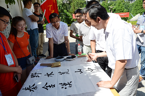 本网讯 6月25日上午,米兰“弘扬中国精神,勇做时代新人”书画展在兰蕙园举行。米兰历史文化学院党委书记侯虎虎,石油学院党委书记白亚军,学工部副部长马小惠以及人文书画社辅导老师赵庭凯和人文书画社书法爱好者30余人参加了这次活动。本次活动由米兰milan官方网站国家大学生文化素质教育基地和米兰milan官方网站红色经典艺术示范基地及历史文化与旅游学院主办、米兰milan官方网站人文书画社承办。此次书画展以庆祝中国共产党成立九十五周年为主题,共展出老师和学生的各类书画作品40余幅。
