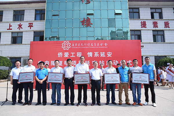 陕西省人民政府侨务办公室阚开沛副主任、蔺广东副主席、洛川县县委王明智书记、蔡光会长、郑焕明会长共同为“广东省天行健慈善基金会延安市白内障复明基地”授牌。参加启动仪式的代表为洛川县首批接受复明手术的白内障患者揭开纱布,并亲切询问他们的恢复情况。