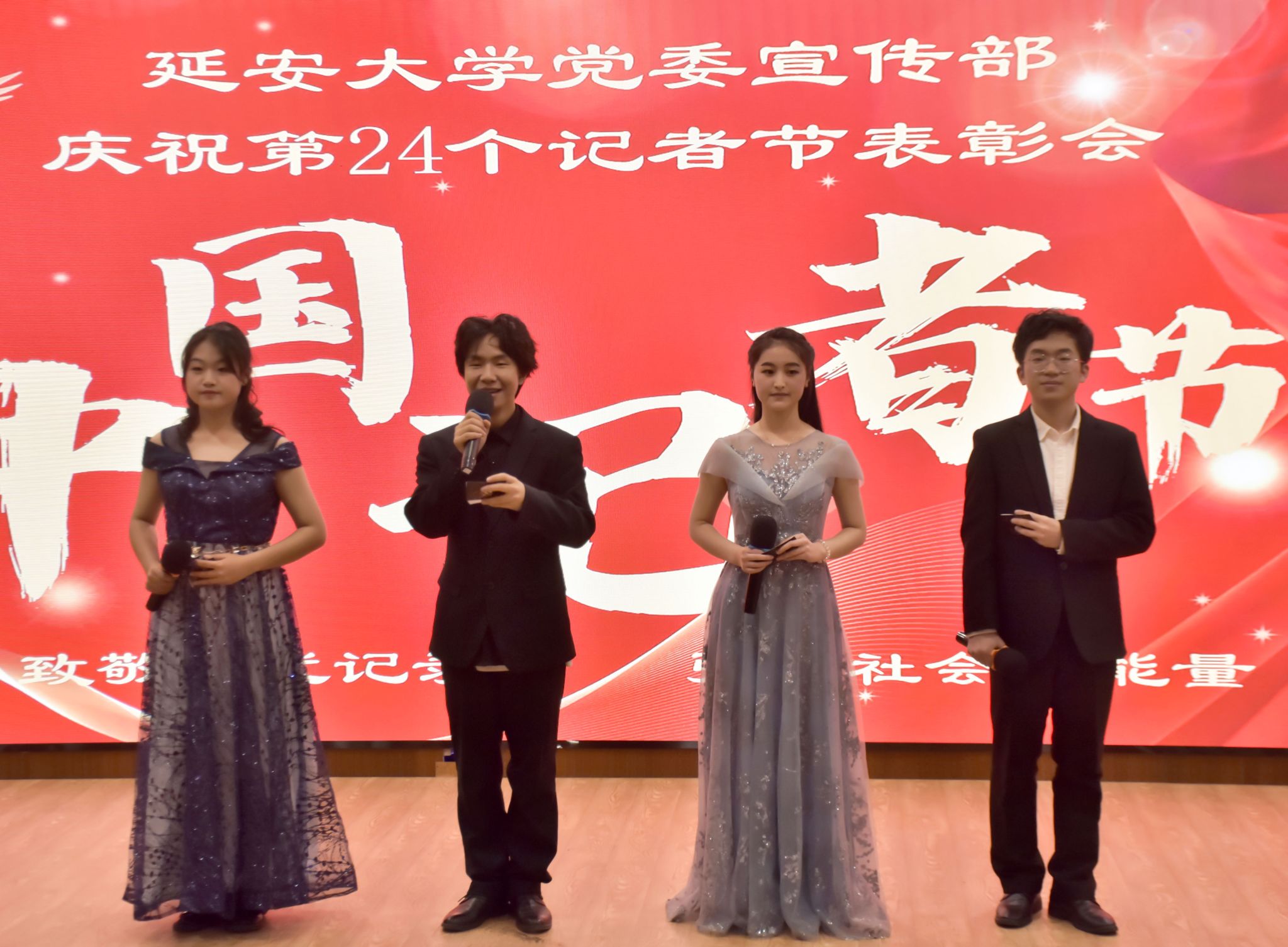 表彰会上,来自党委宣传部传媒中心、圣地红网的学生记者和米兰鲁艺学院的同学为大家献上了丰富多彩的节目表演,米兰milan官方网站诵读协会带来了宣讲节目《新闻巨子—范长江》,党委宣传部老师朗诵了原创诗歌《在我深爱的土地上》。大会在热烈而愉快的气氛中结束。