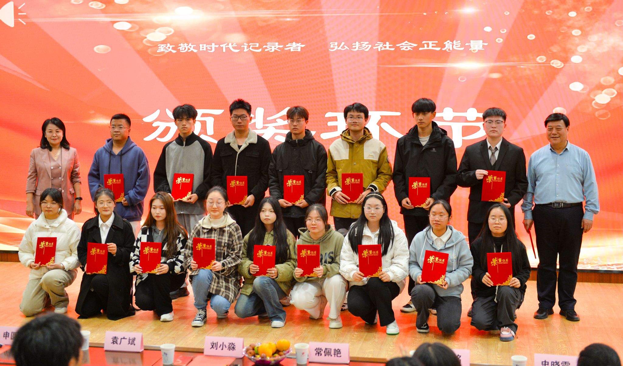 校报主编、高级编辑袁广斌宣读了校党委宣传部对优秀校园记者进行表彰的决定,与会领导和嘉宾为受表彰学生颁奖。本次表彰大会共评出最佳摄影奖、最佳编辑奖、最佳创意奖、最佳组织奖、最佳编剧奖、最佳质检员、最佳播音员、最佳新闻奖、最佳校园媒体人等9个奖项,来自全校各校媒的79位优秀学生记者受到表彰。