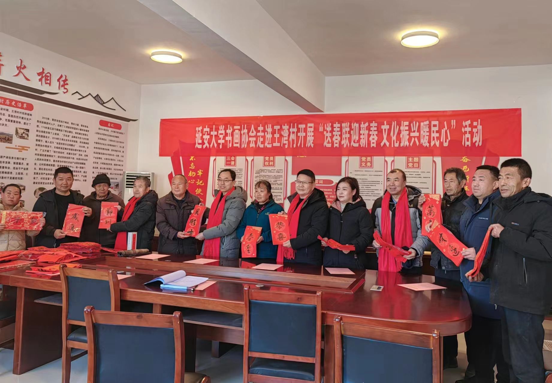 本网讯 龙腾盛世迎新春,翰墨飘香送祝福。新春佳节来临之际,为进一步弘扬中华优秀传统文化,营造祥和、欢乐、喜庆的节日氛围,助力乡村振兴提质增效,1月27日,校教职工书画协会、教师工作部联合宜川县丹州街道王湾村驻村工作队,开展“送春联迎新春 文化振兴暖民心”活动,为群众送去温暖的新春祝福。校教职工书画协会主席、生命科学学院党委书记白亚军,教师工作部部长杨建军,教职工书画协会秘书长、泽东干部学院培训科科长赵廷凯,老年书画社秘书长苗卫东,学校派驻王湾村第一书记高岩,丹州街道办负责同志,王湾村村民参加活动。