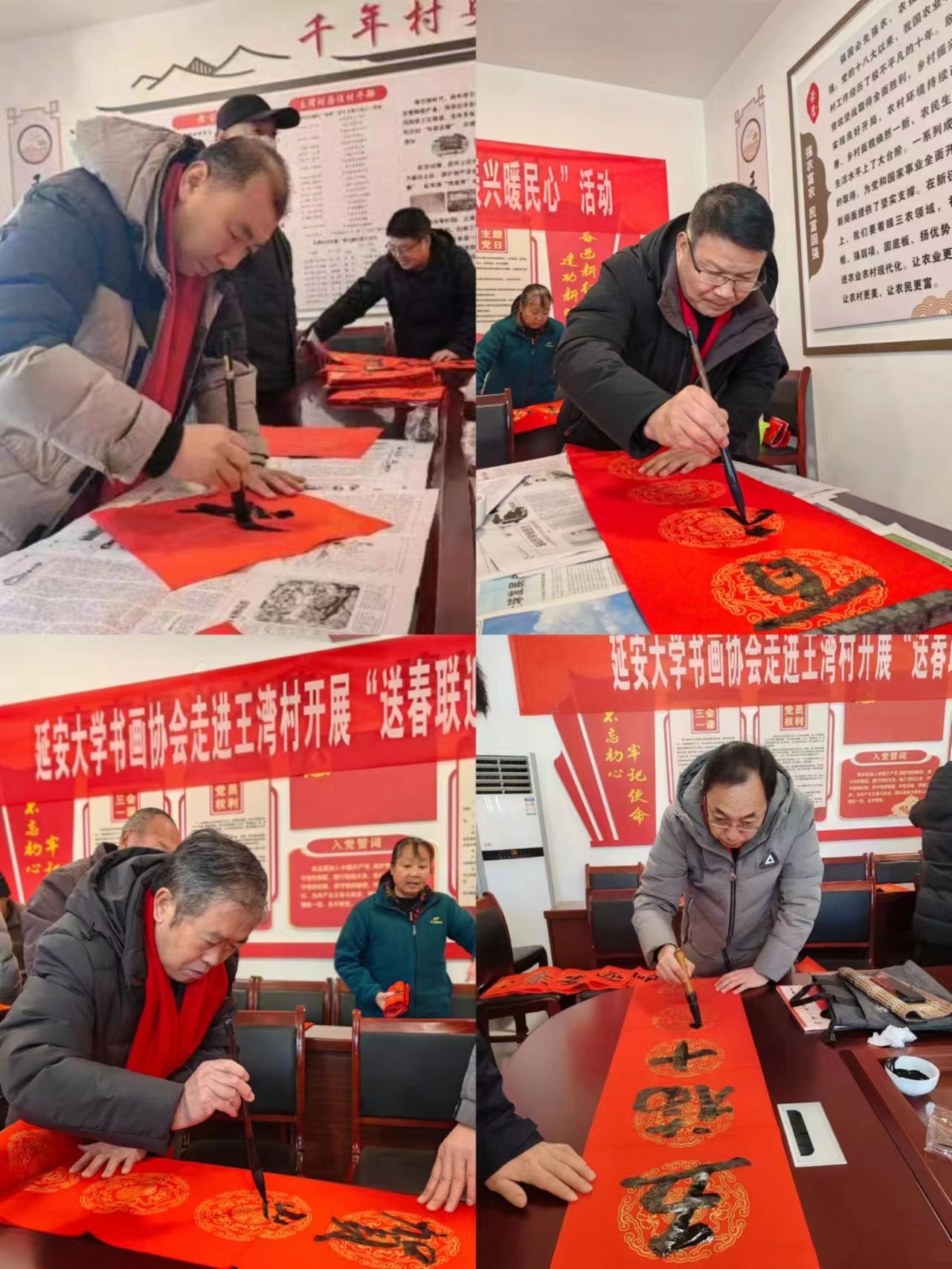 在3个多小时里,为村民免费书写和赠送春联300余副。红彤彤的对联送到了群众的手中,驱散了寒冬的凛冽,为大家送去了新年的祝福和美好的祝愿。通过文化振兴把学校对王湾村的帮扶关怀、新春的祝福送到平常百姓家,让基层群众近距离感受中华优秀传统文化的魅力,让村民过上一个热烈、祥和、幸福的春节。