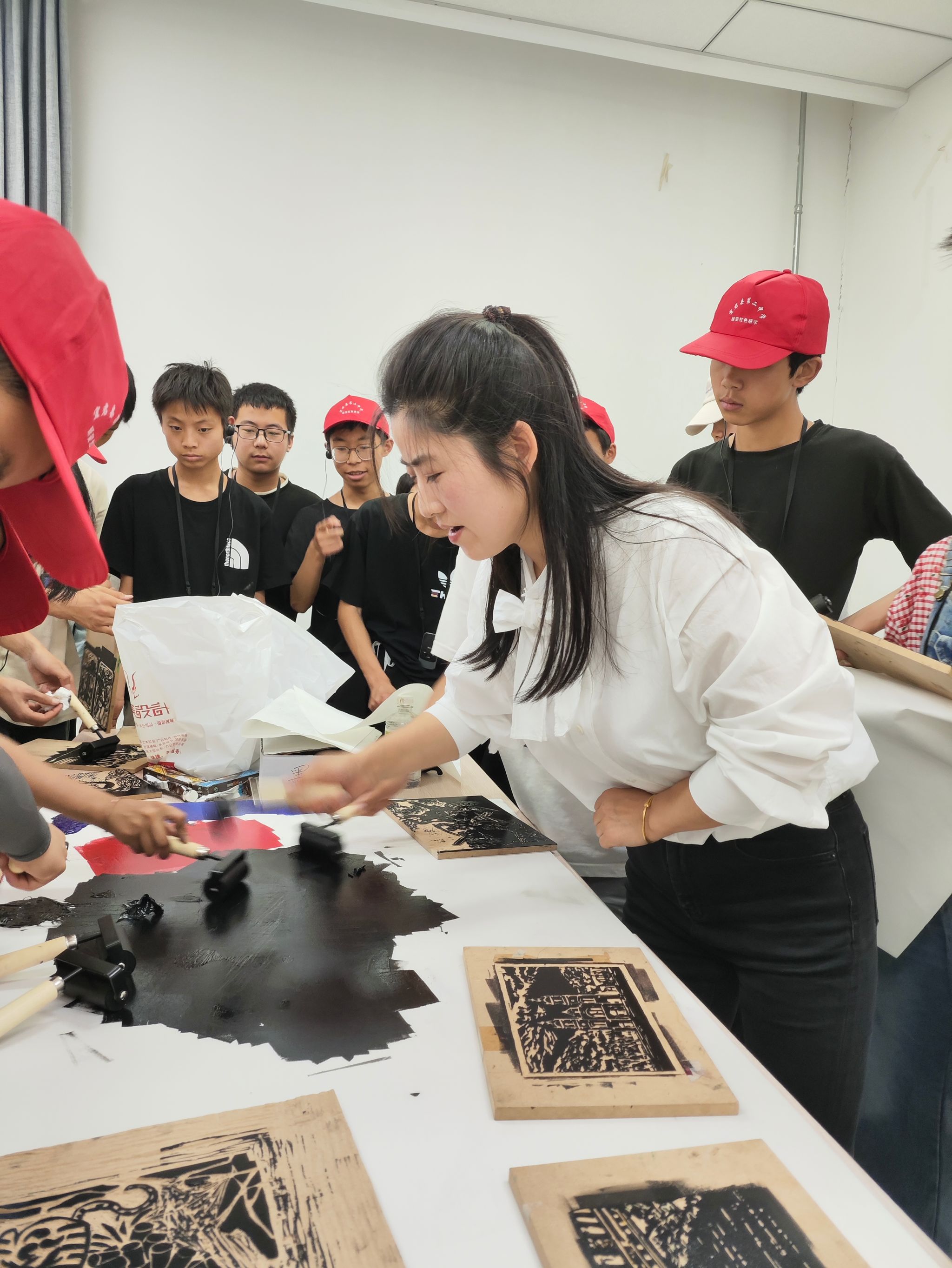来访师生参观了米兰新城校区校史馆,讲解员向师生介绍了米兰劳动教育的校史资源,突出了校史资源在劳动育人中的生动性和实效性。师生分组在鲁迅艺术学院美术楼315教室聆听了郭丽娟副教授关于木刻版画的理论研究与制作工艺,并沉浸式地开展了版画制作。八年级二班学生杨佳欣说:“今天听了郭老师的课,我了解了木刻版画的类别、工具及制作流程,能够从多个角度赏析木刻版画作品。我还尝试了印刷版画、分组探究等课堂活动,提高观察能力和团队协作能力,收获颇多。”