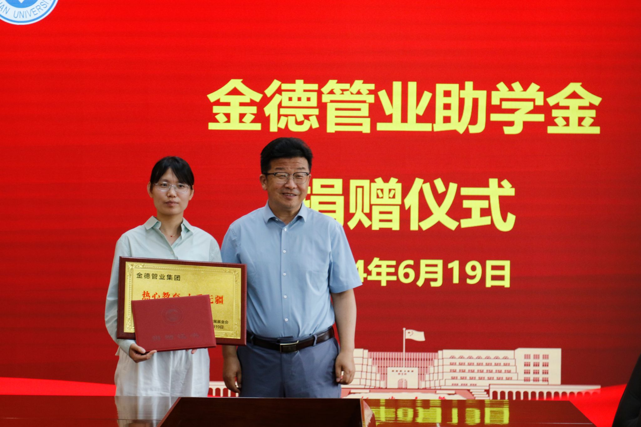 姜庆向金德管业集团颁发了捐赠证书、捐赠牌匾并赠送礼品,并对金德管业集团慷慨解囊、热心教育的善举表示衷心感谢,希望双方建立长期稳定校企合作关系,激励更多的人关注教育事业,同时,期望金德管业集团事业蒸蒸日上,受资助学生早日学业有成,回馈社会。