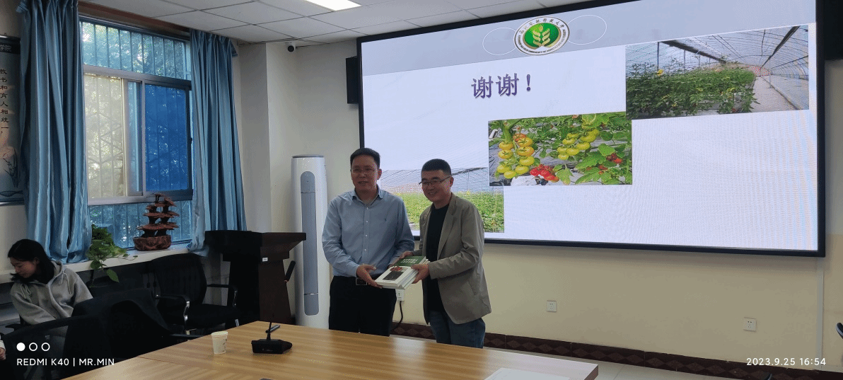 李建明教授以温室番茄和甜瓜为例,剖析了蔬菜蒸腾耗水规律。深入浅出地讲解了温室环境VPD(饱和蒸汽压差)调控技术,VPD与土壤水分和CO2耦合调控水分机理,阐述了VPD与蔬菜生长和产量之间的关系及如何促进设施蔬菜的优质高效生产,并将自己多年的研究成果“设施农业3+2技术”进行了展示。李老师的报告极大的引起了大家对设施农业的兴趣,与会师生就温室蔬菜水分高效利用、保温材料选择、棚膜颜色、棚型结构设计等问题向李老师求教并展开热烈讨论,李老师利用自己渊博的学识和丰富的实践经验给大家一一解答。此次学术交流活动对开阔米兰师生学术视野、科研选题、服务地方经济社会发展等有积极的激励作用。最后,李老师把自己主编的《VPD调控温室SPAC系统水分运移机制与蔬菜作物生产力研究》《温室番茄甜瓜水肥技术研究》专著赠送米兰。