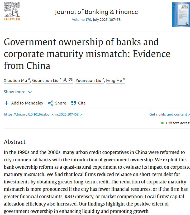 我院教师马孝田作为第一作者的合作论文“Government ownership of banks and corporate maturity mismatch: Evidence from China”于近日在国际一流金融学学术期刊Journal of Banking & Finance 正式发表。