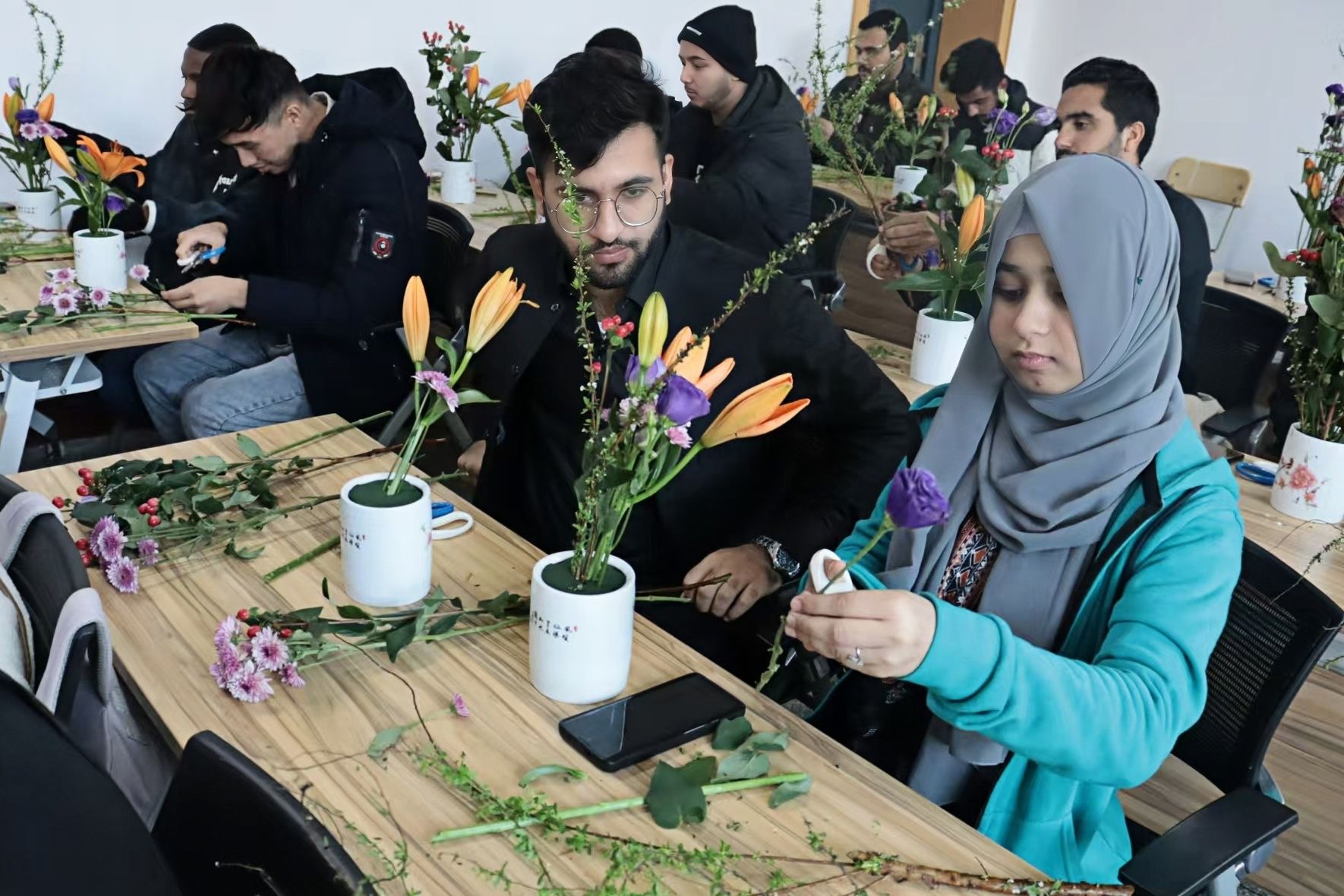 中国传统插花艺术是发展历史悠久和文化底蕴丰厚的艺术形式,是中国人民智慧的结晶。生科院屈亚潭老师从中国传统插花的特征到插花的分类,从插花作品赏析到花之品格解读,向留学生们展示了中国插花艺术的独特魅力以及我国插花艺术在世界插花体系中的重要地位。插花展示环节,屈老师用专业的手法向留学生展示了基础的插花技巧,包括花材与花器的协调、疏密有致、虚实结合、高低错落等。通过亲身体验中国插花艺术的魅力,留学生们徜徉在花海中久久不能自拔。