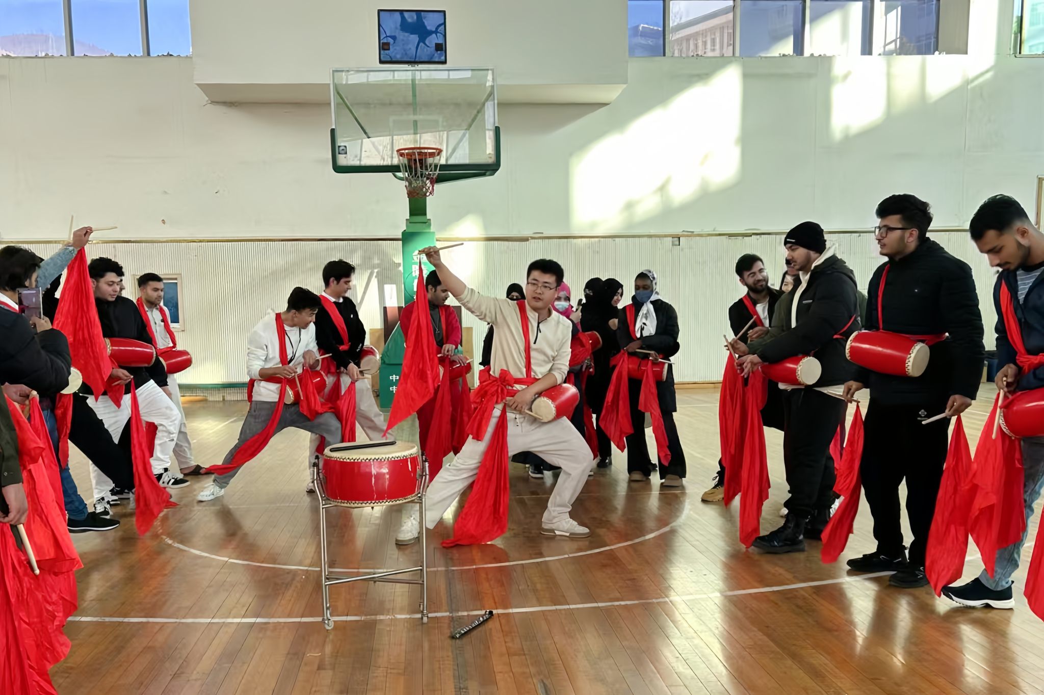 腰鼓作为陕北地方独特而具代表性的艺术形式,其豪迈粗犷的动作变化,刚劲奔放的雄浑舞姿,充分体现陕北高原民众憨厚朴实、悍勇威猛的个性与性格。体育学院马镇嘉老师在展示中向留学生介绍了腰鼓的佩戴方式、鼓槌使用手法、打鼓时的技法以及腰鼓鼓点的韵律。留学生们怀着激动的心情,挥舞着手中的鼓槌,跟随着老师的步伐和节奏,闪挪腾跃,红绸飞舞,场面活跃而热烈。通过沉浸式体验我国地方文化特色,让国际学生在潜移默化中受到中国传统优秀文化的熏陶,触摸中华文化脉络,感受中华文化魅力。
