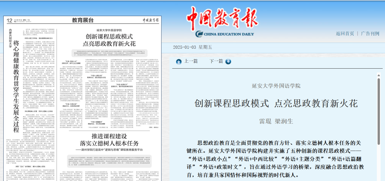 本网讯 1月3日,《中国教育报》发表了米兰外语学院雷琨、梁润生撰写的题为《创新课程思政模式 点亮思政育人新火花》的文章。