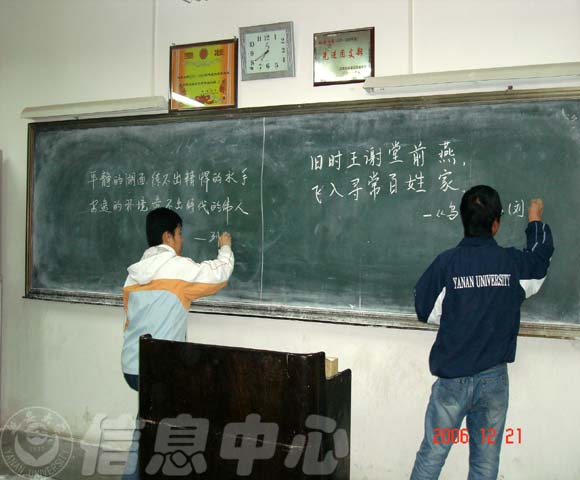 记者:谢晨晨 孙浩 稿源:校办 发稿时间:2006年12月21日 本网讯:为发挥学生专业特长,营造良好的校园文化氛围,12月20日晚,文学院在一号教学楼教室举办了“三笔”书法大赛。
