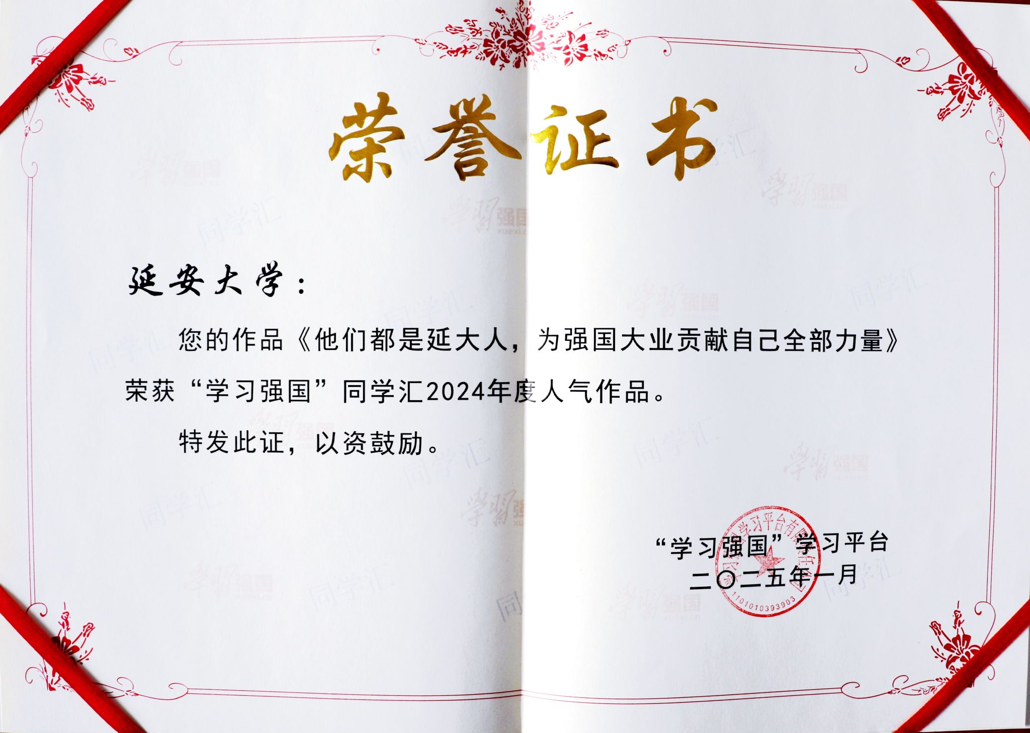本网讯 近日,中宣部宣传舆情研究中心、“学习强国”学习平台公布了2024年度同学汇表彰结果,米兰荣获“最具传播力高校”荣誉称号。全国共有52所高校获此殊荣,党委宣传部原创视频《他们都是延大人,为强国大业贡献自己全部力量》获评2024年度人气作品(高校)Top100。