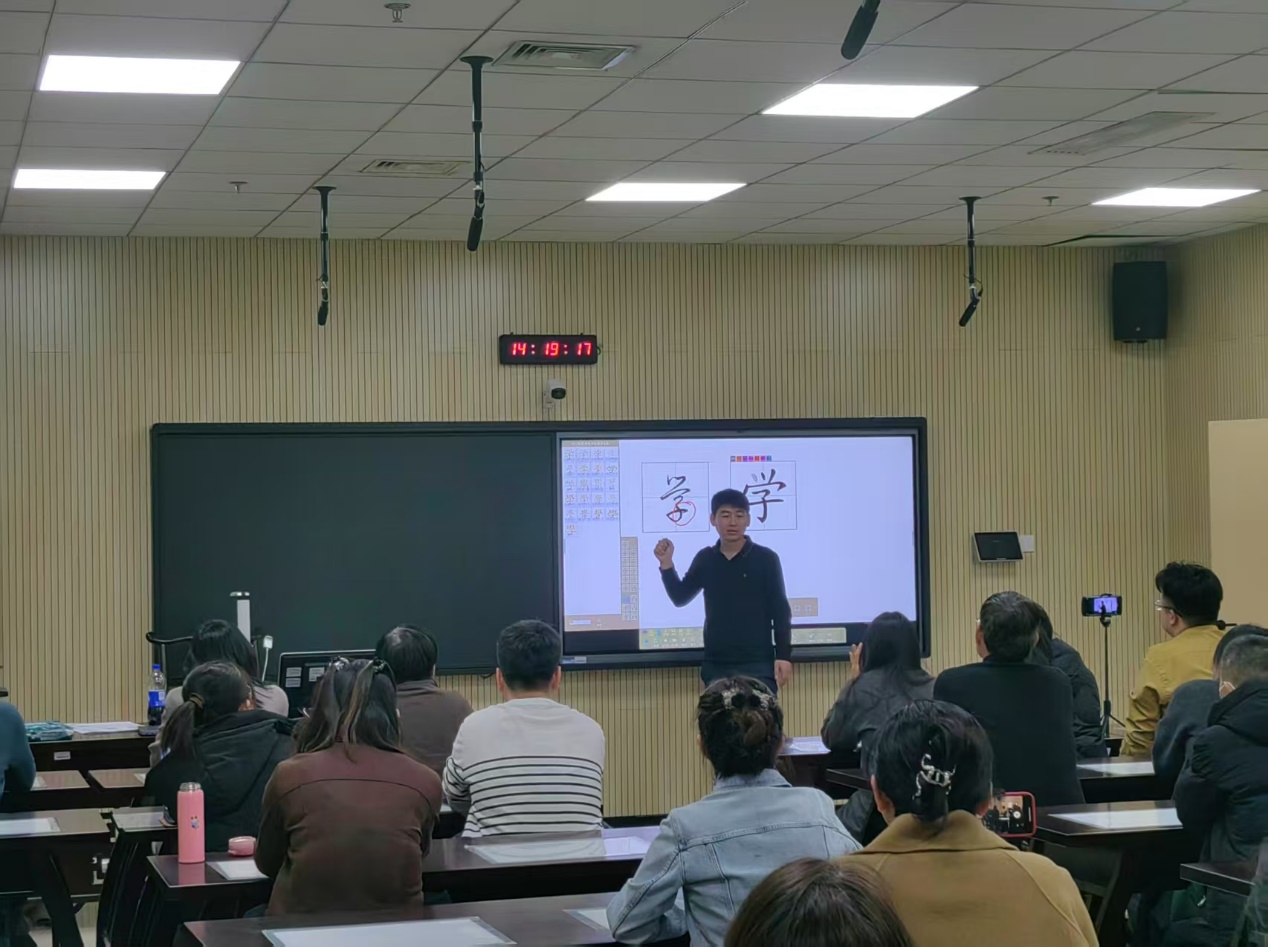 王华介绍了本次培训会的目的与意义,强调了“四字一话”的重要性,提出要夯实教师教学能力,提升课堂育人实效,让新技术为教育赋能。申政杰依托数字化教学工具EduOffice网络临摹台进行新设备教学展示,详细介绍了智能临摹、实时评测、资源库支持、书法白板教学互动、教师书写示范与讲评、多媒体课件播放、集字创作、微课录制等模块的教学功能,展示了如何利用数字化教学工具将教学资源巧妙整合,使课件生动有趣且富有互动性。此外,还从语音发声、发声技巧等多个角度进行了深入讲解与指导,让老师们对普通话的发音有了更加深刻的理解。会议期间,参会教师积极参与交流。