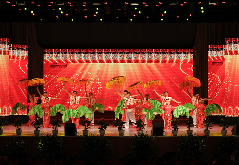 欢天喜地笑盈盈,扭起秧歌迎新年。晚会在教职工舞蹈协会带来的热情欢快的舞蹈《欢庆秧歌》中拉开了序幕。男子身着白衣,手握伞柄,上下舞动,掌控自如。女子一袭红衣,手持折扇,五彩交织,充满活力。他们踩着鼓点,伴着节奏,展现出陕北人的自信与豪迈。