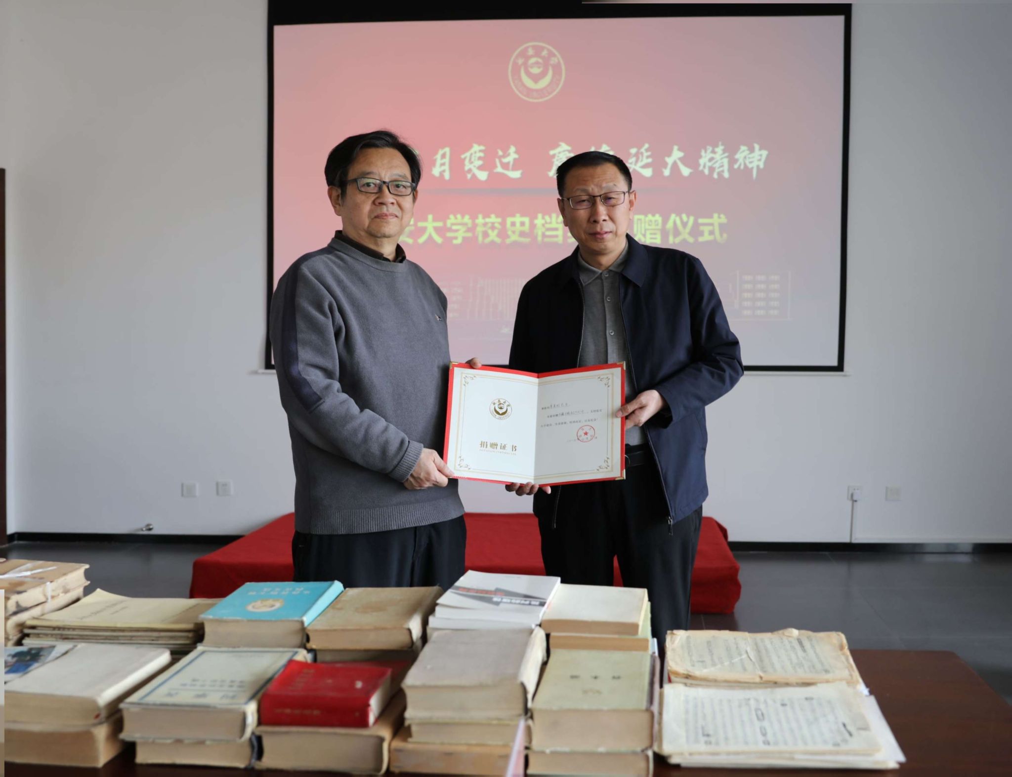本网讯 4月7日,为助力学校红色资源育人示范校建设,发挥红色校史文化育人功能,丰富档案馆、校史馆馆藏,学校在新城校区校史馆举行“承载岁月变迁,赓续延大精神”校史档案捐赠仪式。老校友后代及职工代表李道刚、乔文章、柳樱、许童超等四名捐赠者出席仪式,副校长王延峰以及档案馆、校史馆、博物馆全体教职工参加捐赠仪式。捐赠仪式由档案馆、校史馆、博物馆馆长王蕊蕊主持。