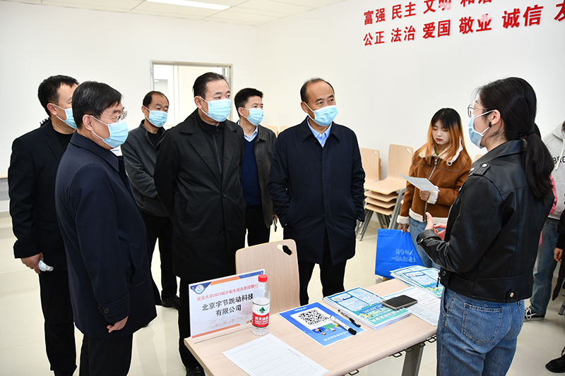 我校党委副书记、校长高子伟,副校长陈华和延安市人力资源和社会保障局副局长李锦保,延安市人才交流服务中心主任闫波涛等深入招聘会现场,了解疫情下企业的人才需求和学生报名情况,听取用人单位对学校人才培养、就业服务等方面的意见和建议,并和部分用人单位代表及毕业生交流。部分学院的院长和书记也来到现场,了解本学院学生的求职状况,主动对接相关用人单位,构建友好合作关系。各学院副书记、辅导员全程参与招聘会。