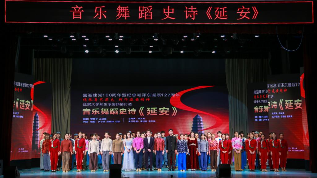 音乐舞蹈史诗《延安》编剧为曾鹿平和王延雄,作曲、编曲为宁小兵、张晓峰、刘乐;总导演为田大成,执行导演为李延俊和曹军民,所有演职人员均为鲁迅艺术学院师生。该剧将延安时期的经典作品与原创作品相结合,将历史风貌与时代特征有机融合,首次通过音乐、舞蹈、旁白、音画相融合的艺术表达方式将延安精神呈现在舞台上,通过序曲《想延安》、第一幕《创世歌》、第二幕《延水谣》、第三幕《拓荒曲》、第四幕《东方红》及尾声《续华章》六个篇章,艺术再现了红军长征到达吴起镇胜利会师,东渡黄河离开陕北期间发生在革命圣地延安的撼人心魄的历史事实,一组组荡气回肠的人物形象、一幕幕波澜壮阔的震撼瞬间、一幅幅生动凝练的历史画卷,组成了一幅中国共产党人艰难创业的伟大史诗,奏响了延安精神的浩然长歌。作品中也穿插《抗日军政大学校歌》《陕北公学校歌》《鲁迅艺术学院校歌》联唱,反映了延安时期学子们的精神风貌。