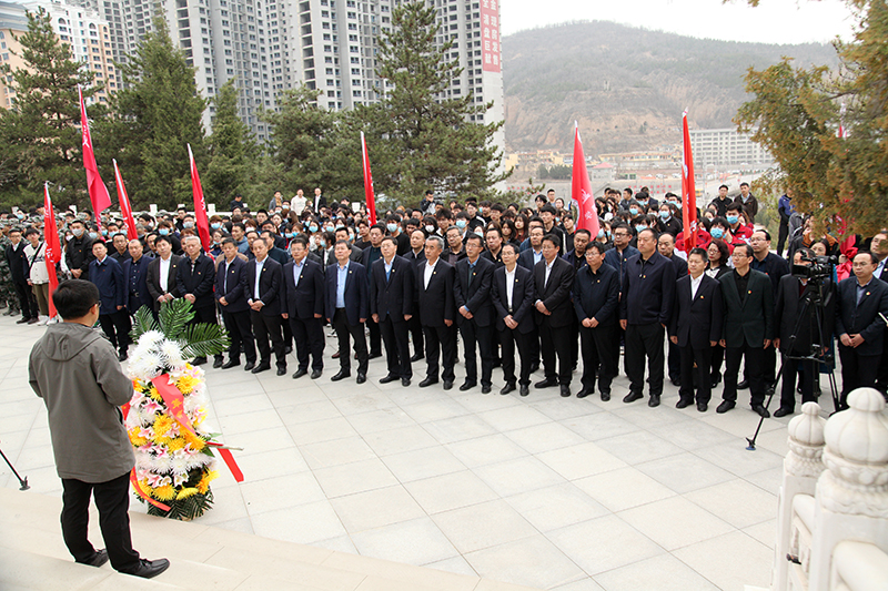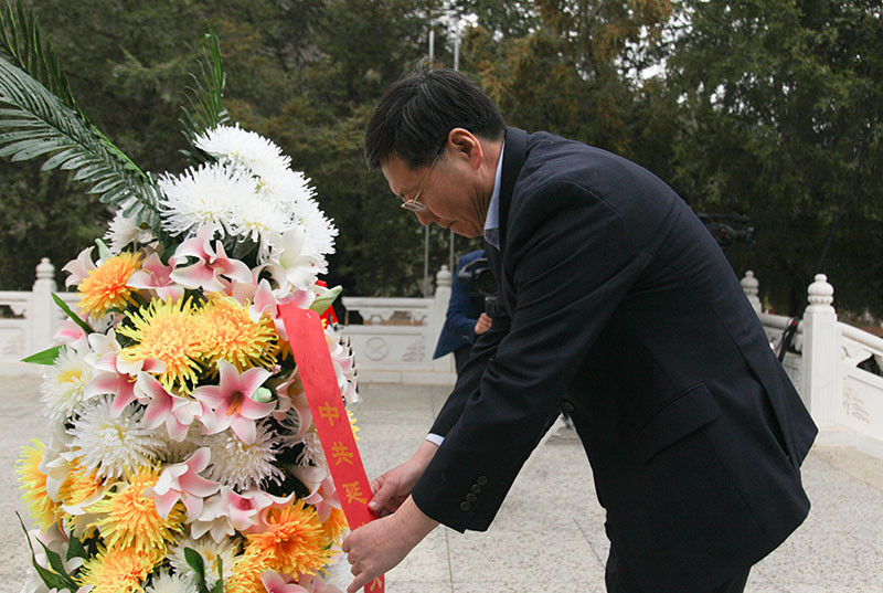 校党委书记张金锁缓步登上纪念碑基座,仔细整理花篮缎带,向烈士纪念碑鞠躬致敬。全体师生行鞠躬礼,并肃立向“四八”烈士默哀。
