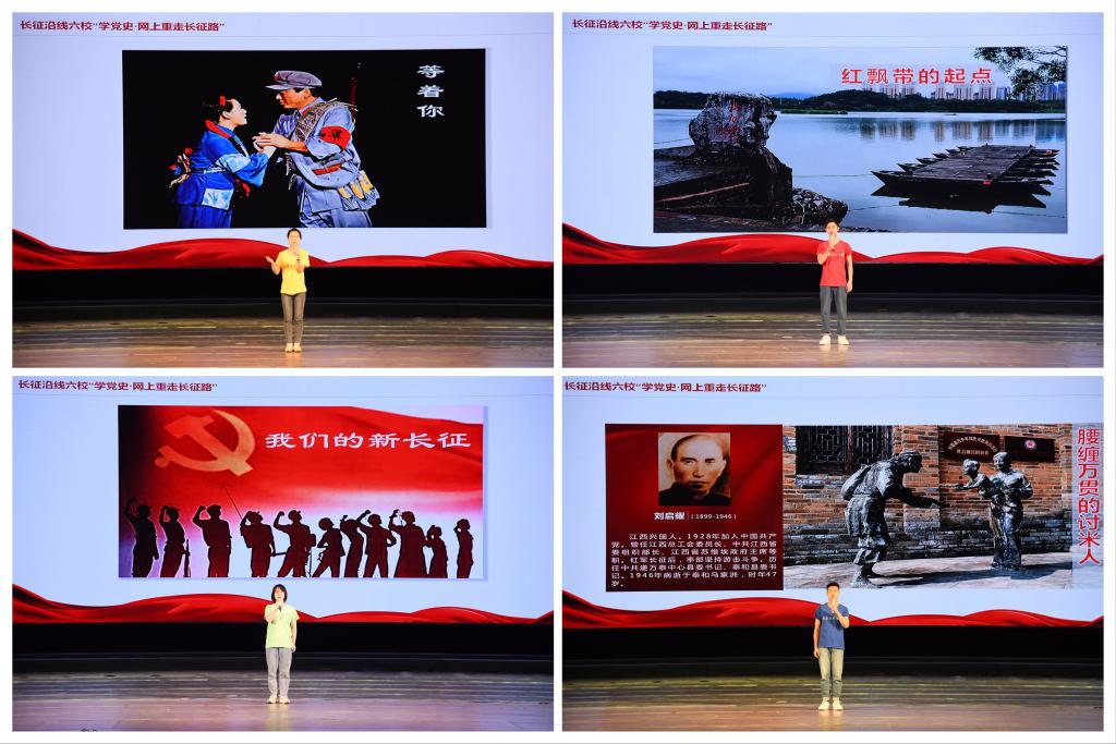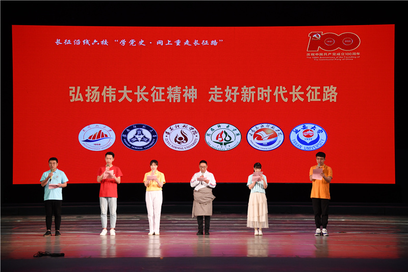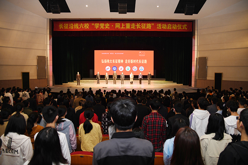随后,六校领导共同上台,触动大屏幕,“学党史·网上重走长征路”正式启动。