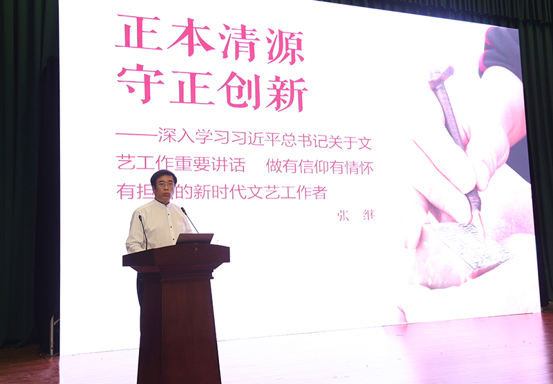 张继作了题为《正本清源 守正创新》的主题宣讲。他认为,“正本清源,守正创新”应该是包括书法艺术在内的所有艺术门类的重要课题。作为新时代文艺工作者,有责任把中华民族优秀传统文化发扬光大,要本着对国家、对人民、对历史,更是对自己负责的态度,不断学习、不断实践、不断创新,力争以“十年磨一剑”的工匠精神,创作出传统、时代、个性高度统一的,无愧于时代、无愧于人民、无愧于使命的精品佳作,不断攀登艺术新高峰。