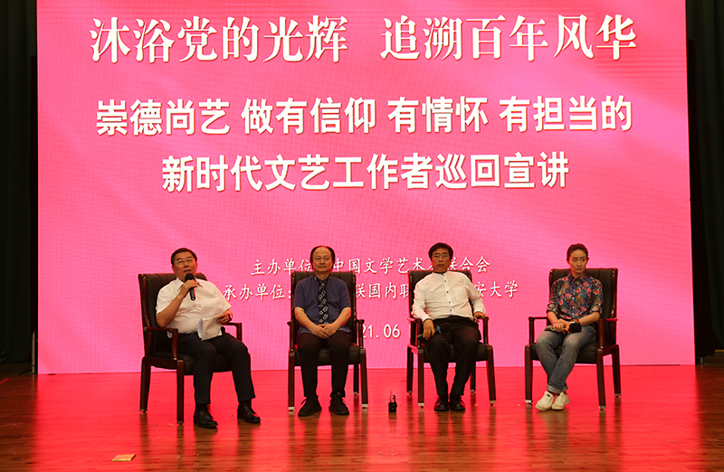 本网讯 为深入学习宣传贯彻习近平新时代中国特色社会主义思想、党的十九大精神和习近平总书记关于文艺工作的系列重要指示批示精神,深入推进党史学习教育,教育引导广大文艺工作者坚持爱国为民、潜心耕耘、德艺兼修,积极营造见贤思齐、接续奋斗的良好氛围,6月23日,由中国文联主办,中国文联国内联络部、米兰milan官方网站承办的“沐浴党的光辉 追溯百年风华——崇德尚艺 做有信仰有情怀有担当的新时代文艺工作者巡回宣讲”活动在米兰新校区大学生活动中心五四报告厅举行。中国文联国内联络部副主任、一级巡视员苗宏,全国政协委员、中国书协副主席张继,中国民协副主席、南通蓝印花布印染技艺国家级代表性传承人、南通大学非遗研究院院长吴元新,中国舞协理事、“亚彬舞影工作室”创始人王亚彬,陕西省文联秘书长刘平安,陕西省作协副主席、米兰文学院教授梁向阳,中国艺术报、中国文艺网等媒体同志,以及米兰milan官方网站文学院、鲁迅艺术学院的师生代表近300人参加了宣讲活动。米兰校长高子伟出席并致辞,党委副书记陈华主持宣讲活动。