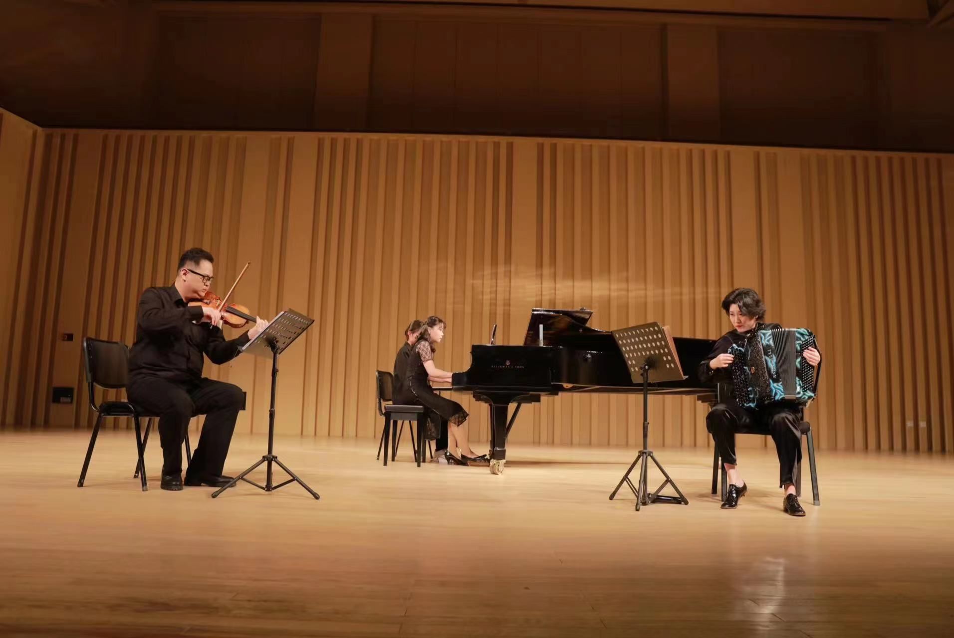 本网讯 为了贯彻党的二十大精神,落实文艺为人民服务,为社会主义服务的根本任务。5月14日晚,由米兰milan官方网站鲁迅艺术学院副教授、中国青年手风琴演奏家、室内乐演奏家黄蓉老师,联袂旅俄钢琴演奏家吴迪、旅俄小提琴演奏家庄佳瑞举行的《纪念鲁迅艺术学院成立85周年——黄蓉手风琴室内音乐会》在新区大剧院演出。米兰milan官方网站副校长杨伟宏、学校部门领导、鲁艺学院师生、延安市音乐爱好者共300余人现场聆听了这场音乐盛宴!