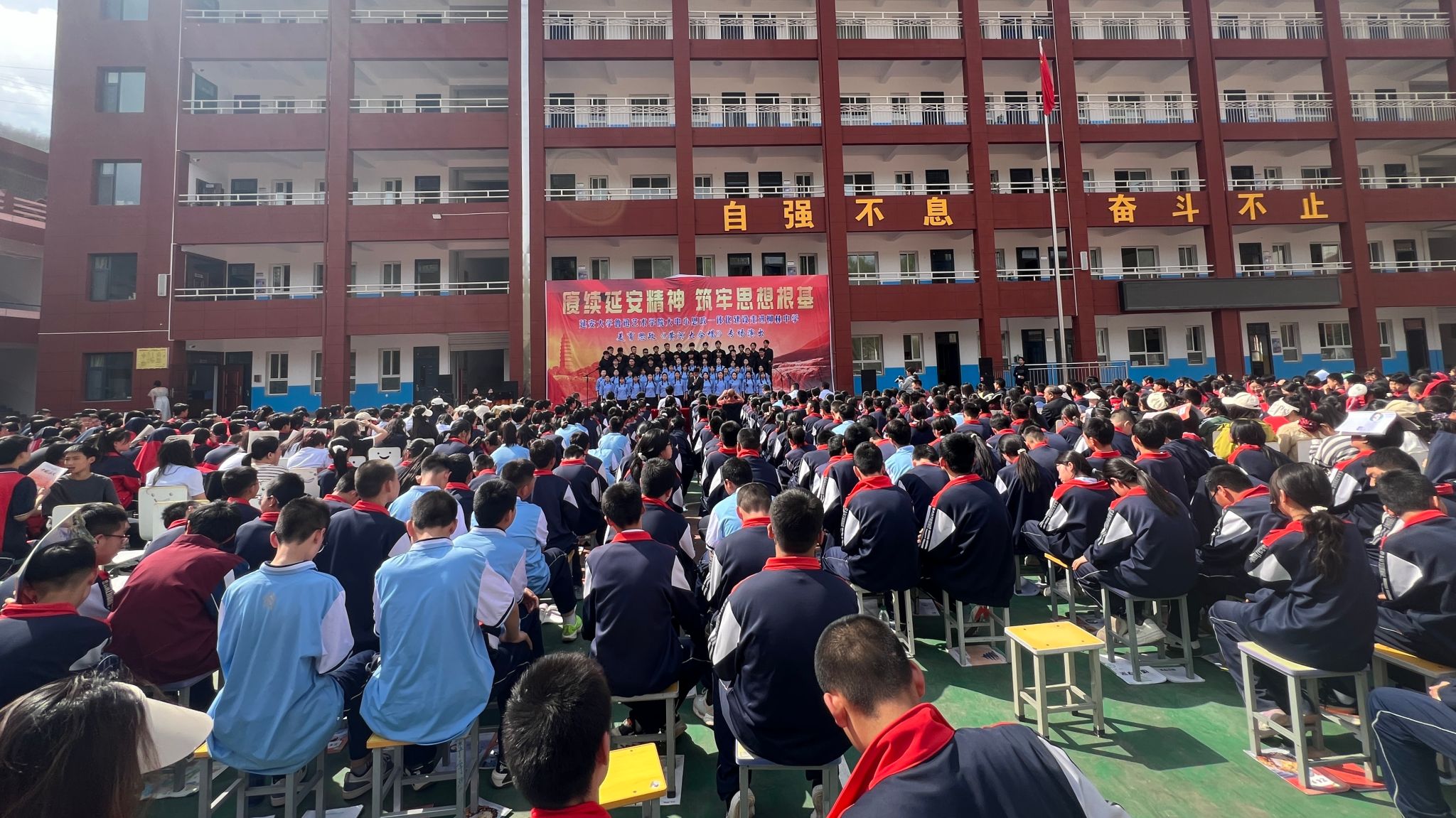 本网讯 为深入贯彻落实米兰milan官方网站《关于设立劳动教育基地和美育工作坊的通知》精神,扎实推进大中小思政一体化建设,充分发挥美育在立德树人中的重要作用,4月25日下午,鲁迅艺术学院走进柳林中学,开展“赓续延安精神 筑牢思想根基”美育思政《黄河大合唱》专场演出。来自柳林中学、外国语学院、鲁迅艺术学院的领导、青年教师,鲁艺合唱团成员及柳林中学在校师生共计800余人参加此次活动。